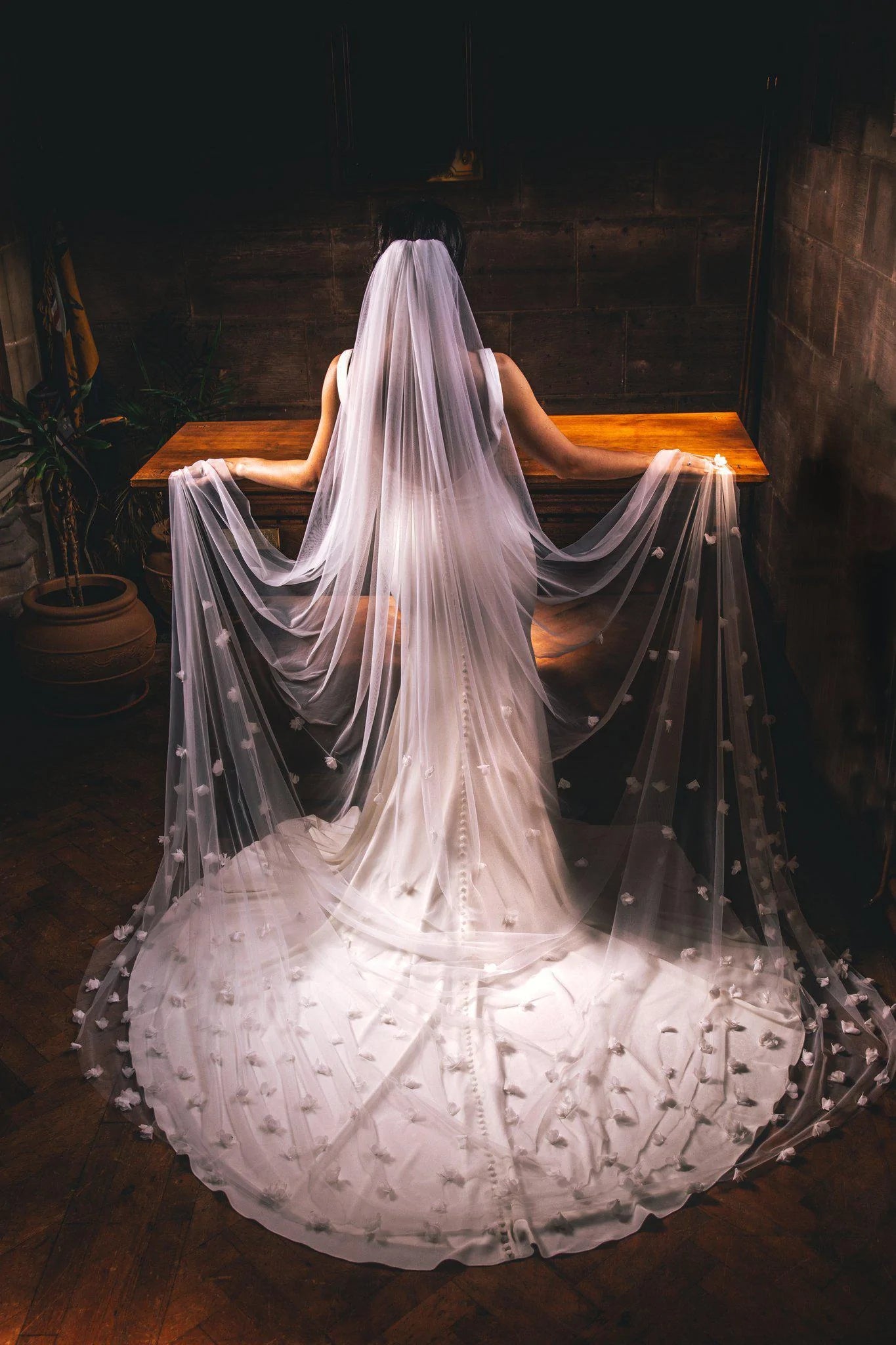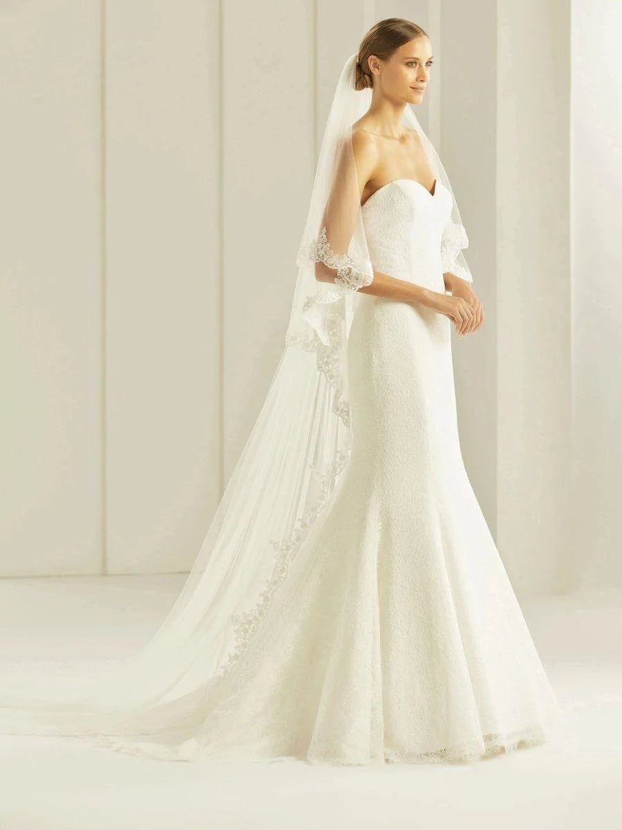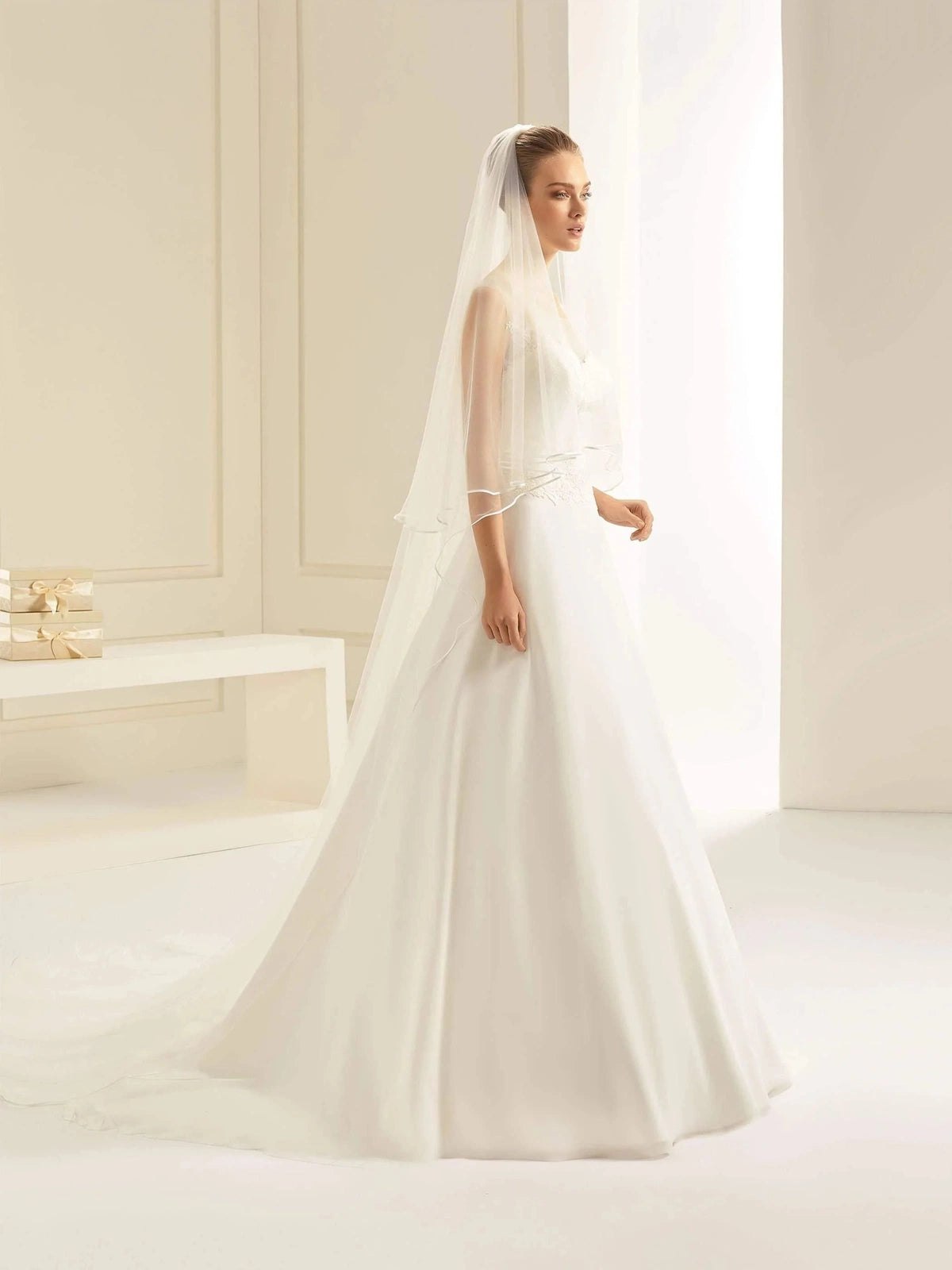 Dramatic, regal, and breathtakingly beautiful, our cathedral-length wedding veil is the ultimate statement piece for your bridal look. Flowing far beyond the hem of your gown, this veil creates a stunning train effect that transforms every step into a moment of pure elegance. Perfect for grand ceremonies and formal settings, the cathedral veil enhances even the simplest gowns with its sweeping silhouette and timeless charm. For brides who dream of making an unforgettable entrance, the cathedral-length veil is the epitome of romance and sophistication.