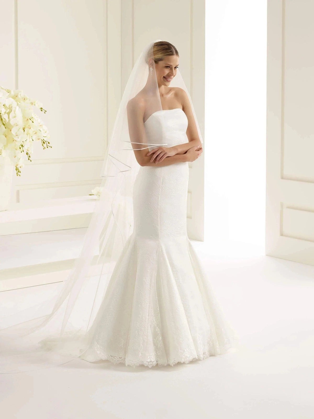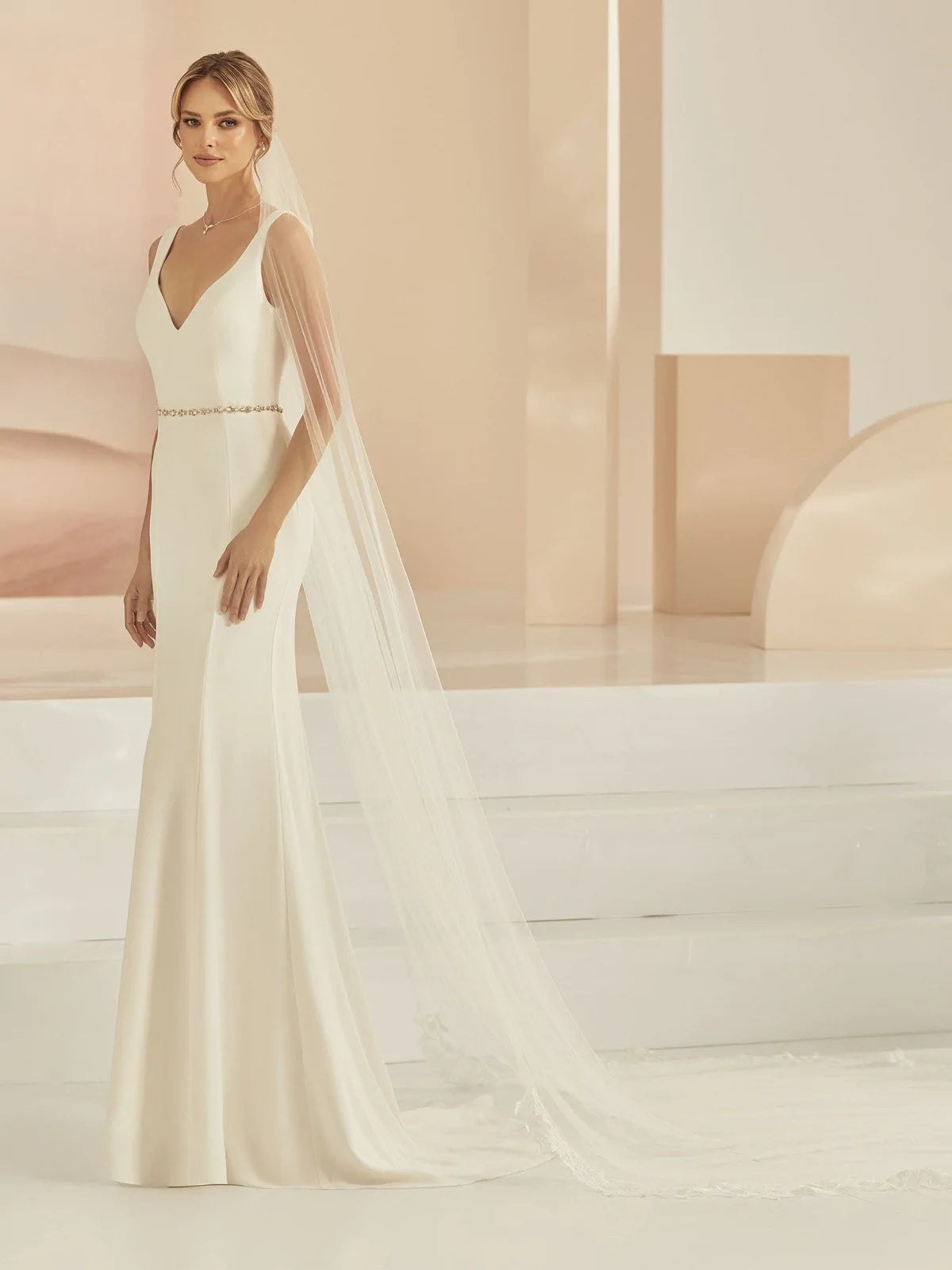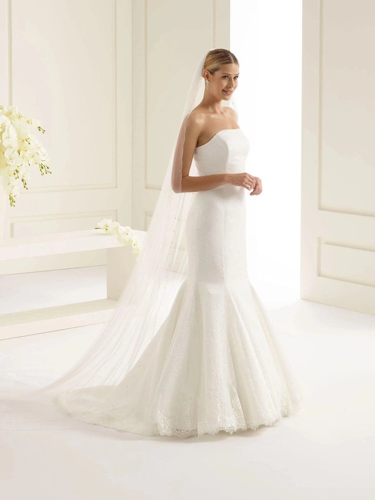 Dramatic, regal, and breathtakingly beautiful, our cathedral-length wedding veil is the ultimate statement piece for your bridal look. Flowing far beyond the hem of your gown, this veil creates a stunning train effect that transforms every step into a moment of pure elegance. Perfect for grand ceremonies and formal settings, the cathedral veil enhances even the simplest gowns with its sweeping silhouette and timeless charm. For brides who dream of making an unforgettable entrance, the cathedral-length veil is the epitome of romance and sophistication.