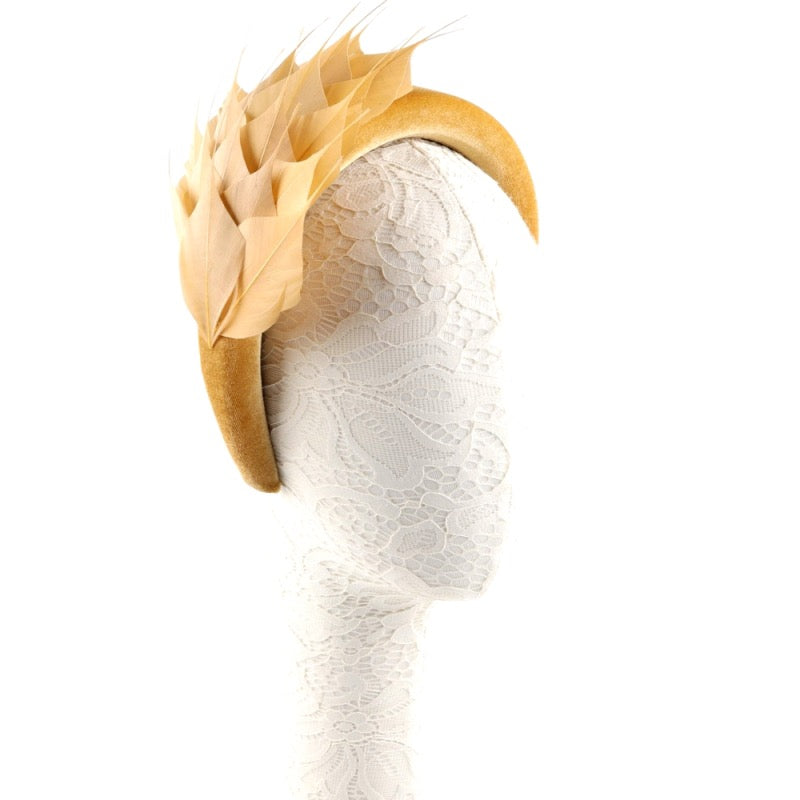 Regular price £63.71A stunning luxury feather fascinator headband. This breathtaking headpiece is rich with a luxurious velvet headband embellished with striking Gold coloured feathers. This certainly is a headdress which is sure to delight and a perfect accessory to complete your outfit for the races, as a wedding guests or mother of the bride.