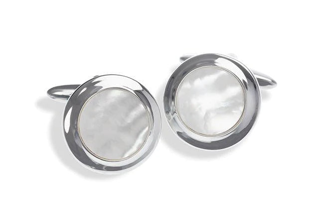 This stylish pair of circular gents cufflinks are beautifully crafted from rhodium for a long lasting polished finish and set with mother of pearl detailing.