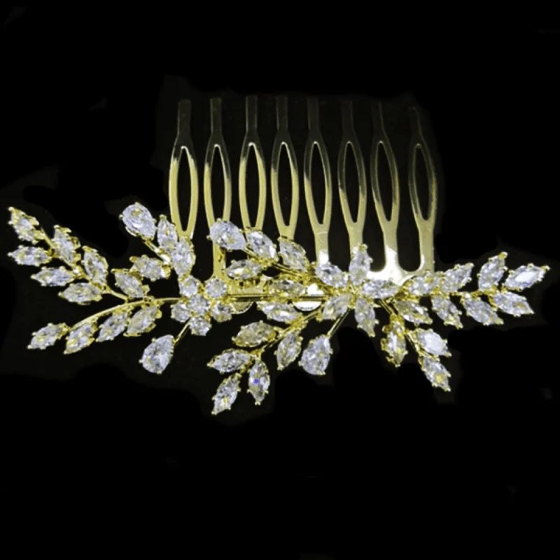 The romantic ethereal beauty of this glamorous gold bridal headdress is a feast for heart and eyes. The headpiece has been delicately created with densely pave set flowers, surrounded by intense sprigs of marquise cut crystals which dance in harmony with ethereal crystals. A stunning bridal hair comb to add that finishing touch to your special day.