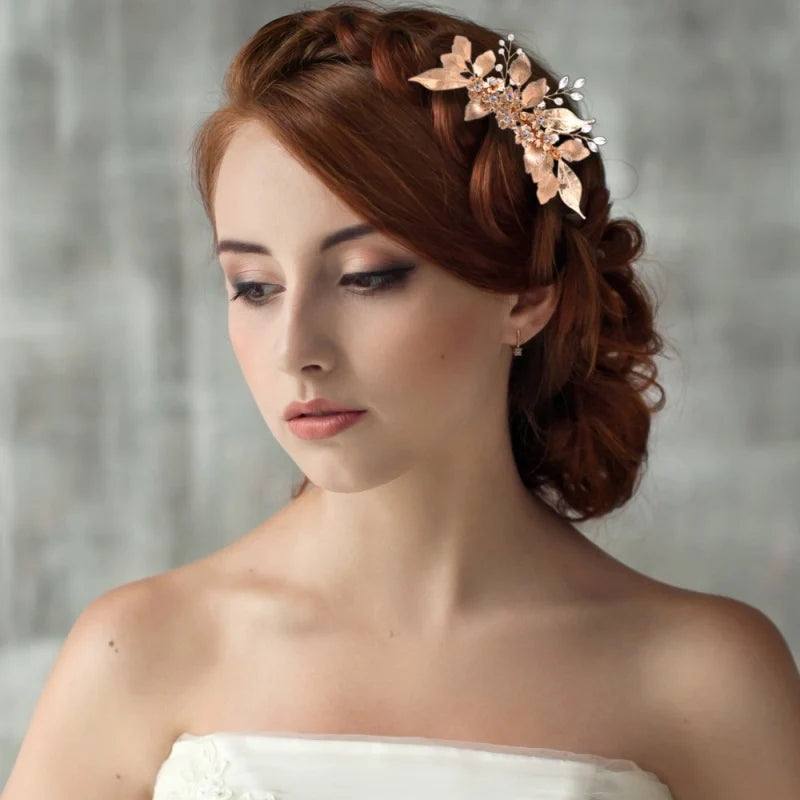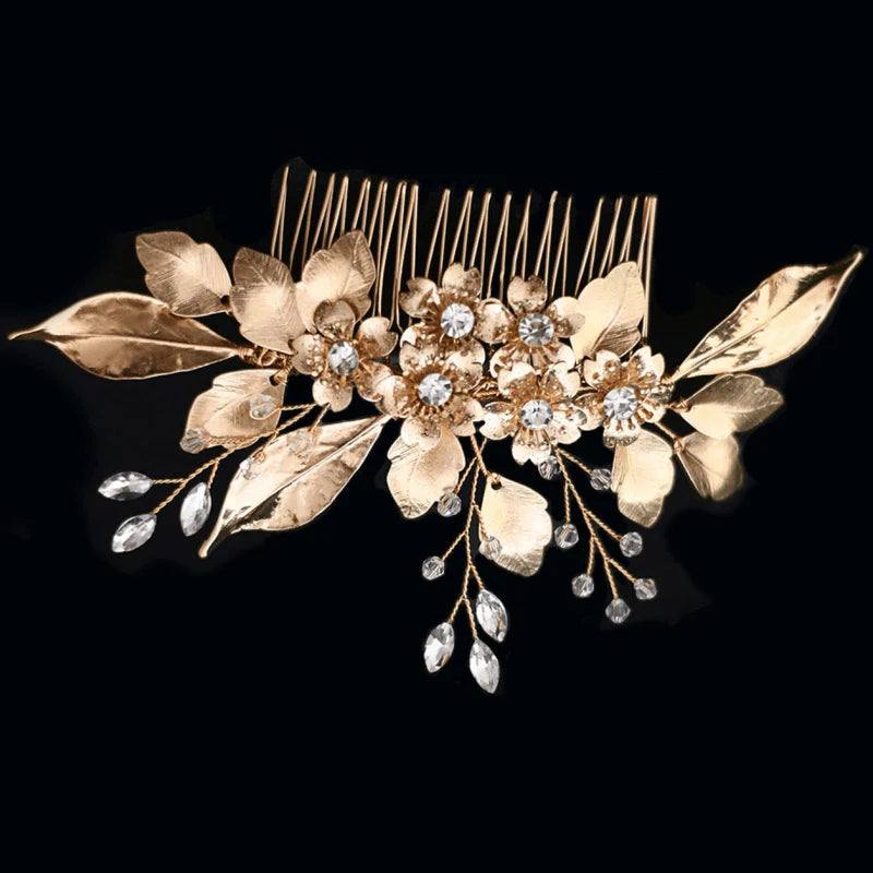 Regular price £49.26This luxury bridal headdress has an adornment of delicate golden flowers and beautifully cocooned by a bed of gleaming golden leaves. This exquisite hair comb will help you to glow and shine like a star on your day of enchantment. Dimensions: 15cm x 8.5cm An intricate finish to bring harmony and sweetness to your look. A beautiful delicate bridal hair comb to complete your bridal look for your special day.