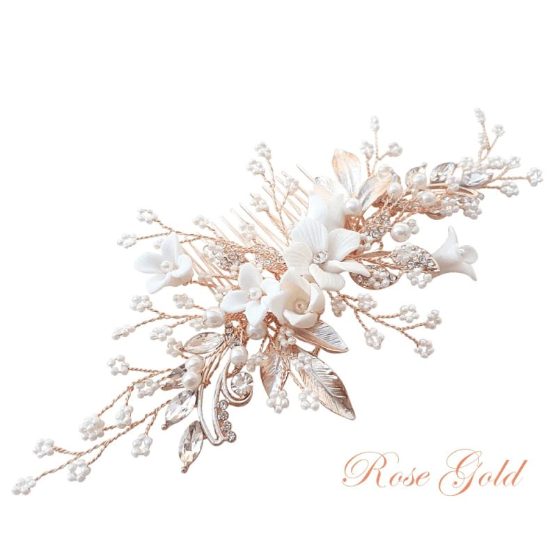 Brides Rose Gold Hair Comb with Crystal & Pearls, A1986