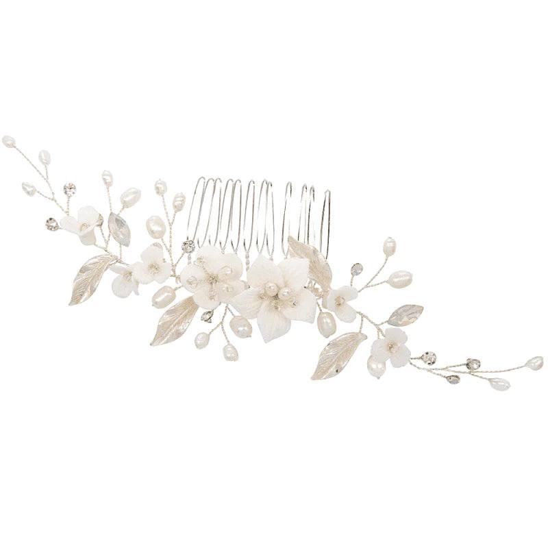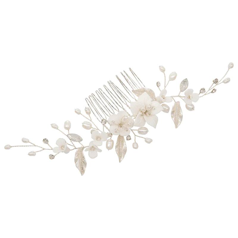 This pretty bridal headdress has an adornment of delicate clay flowers which are beautifully cocooned by a cloud of silver metallic painted leaves, freshwater pearls and Opal crystals all set on a silver finish comb. An intricate finish to bring harmony and sweetness to your wedding look. A beautiful delicate bridal hair comb to complete your bridal look for your special day.