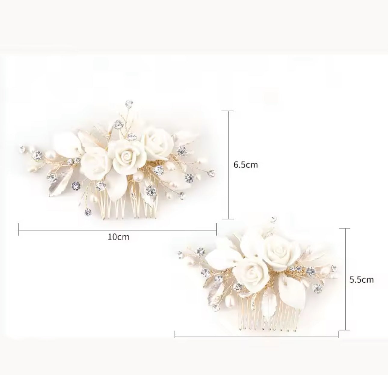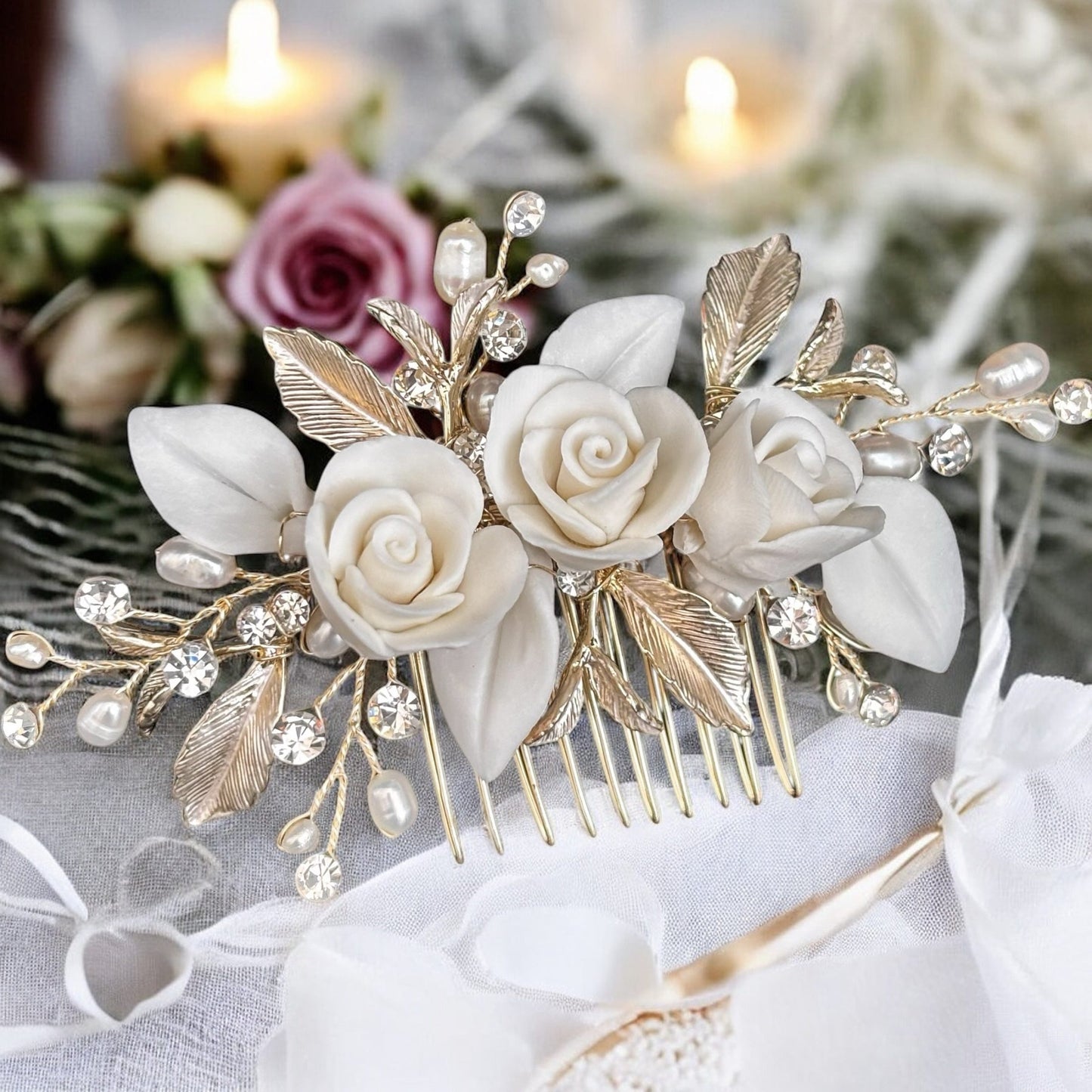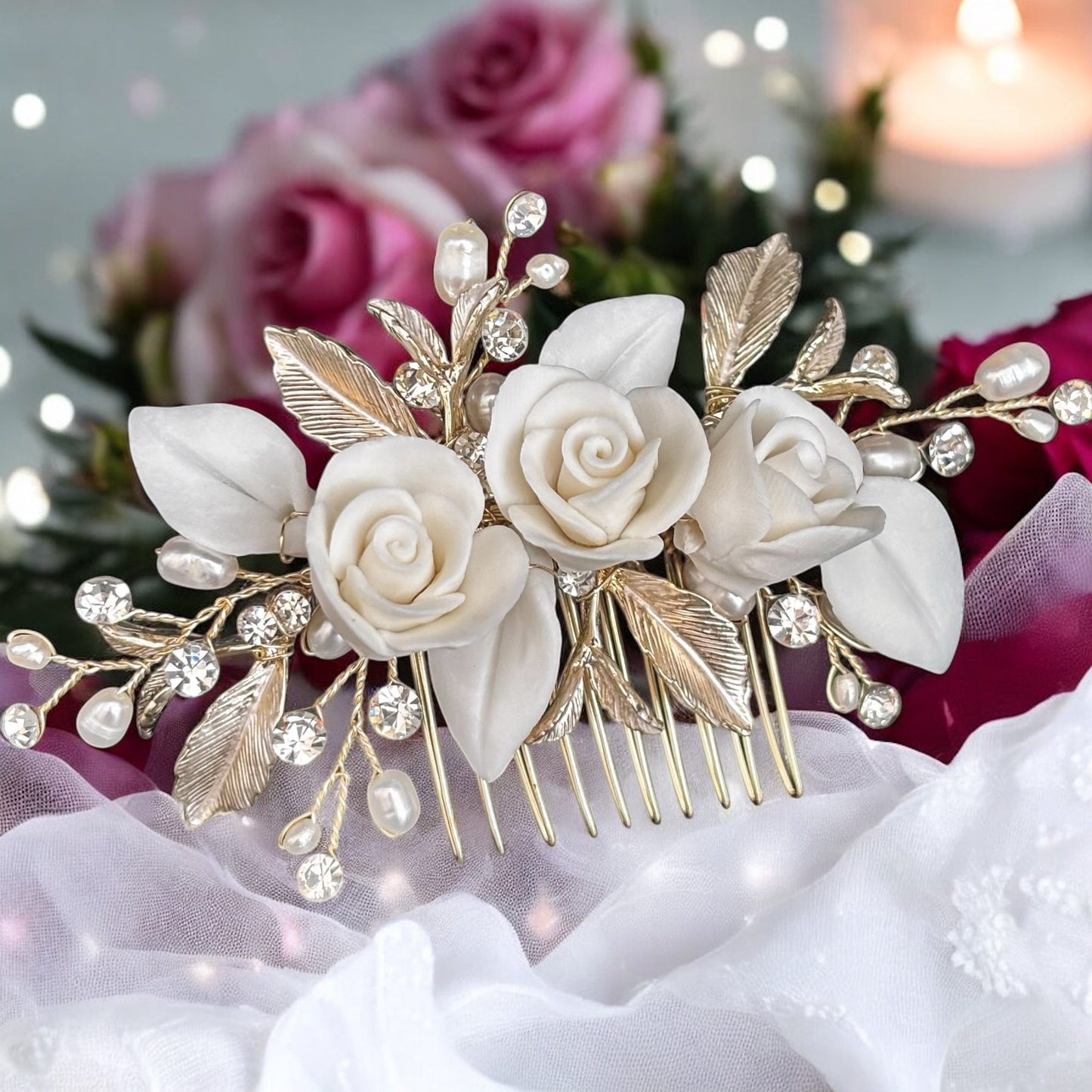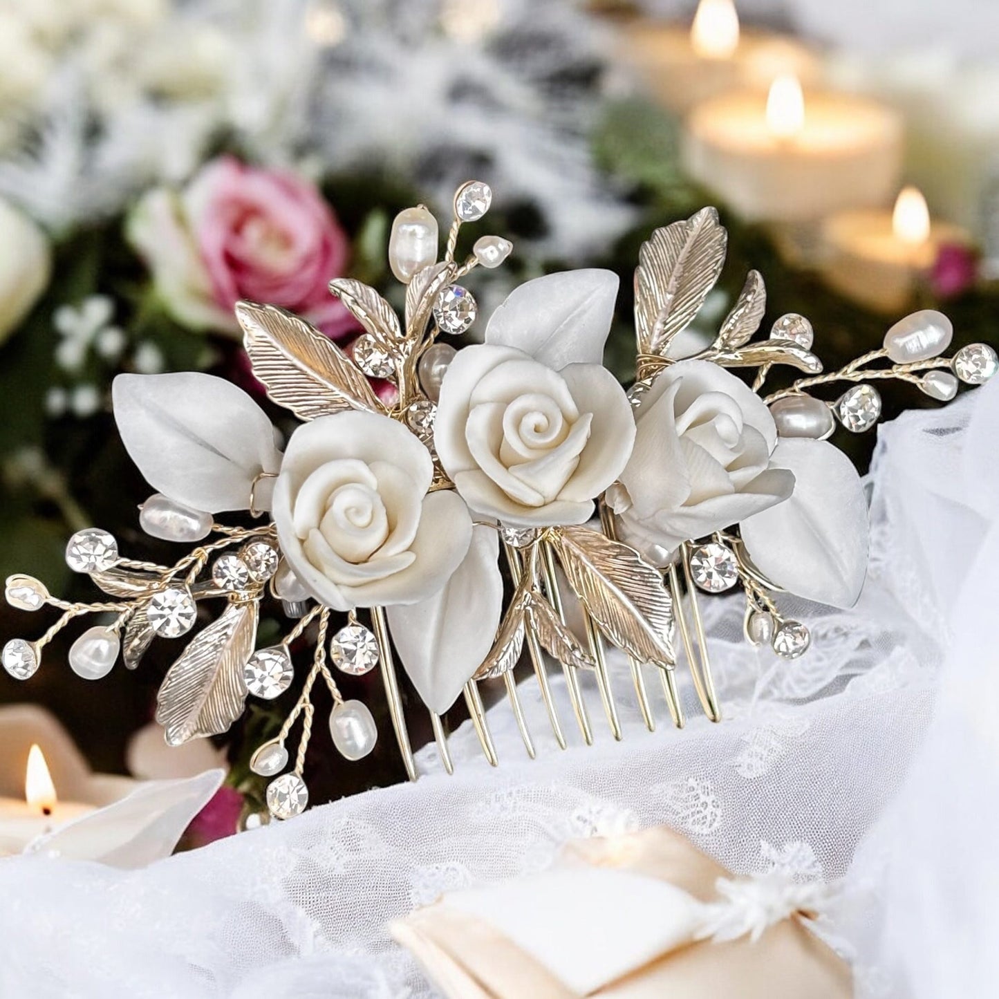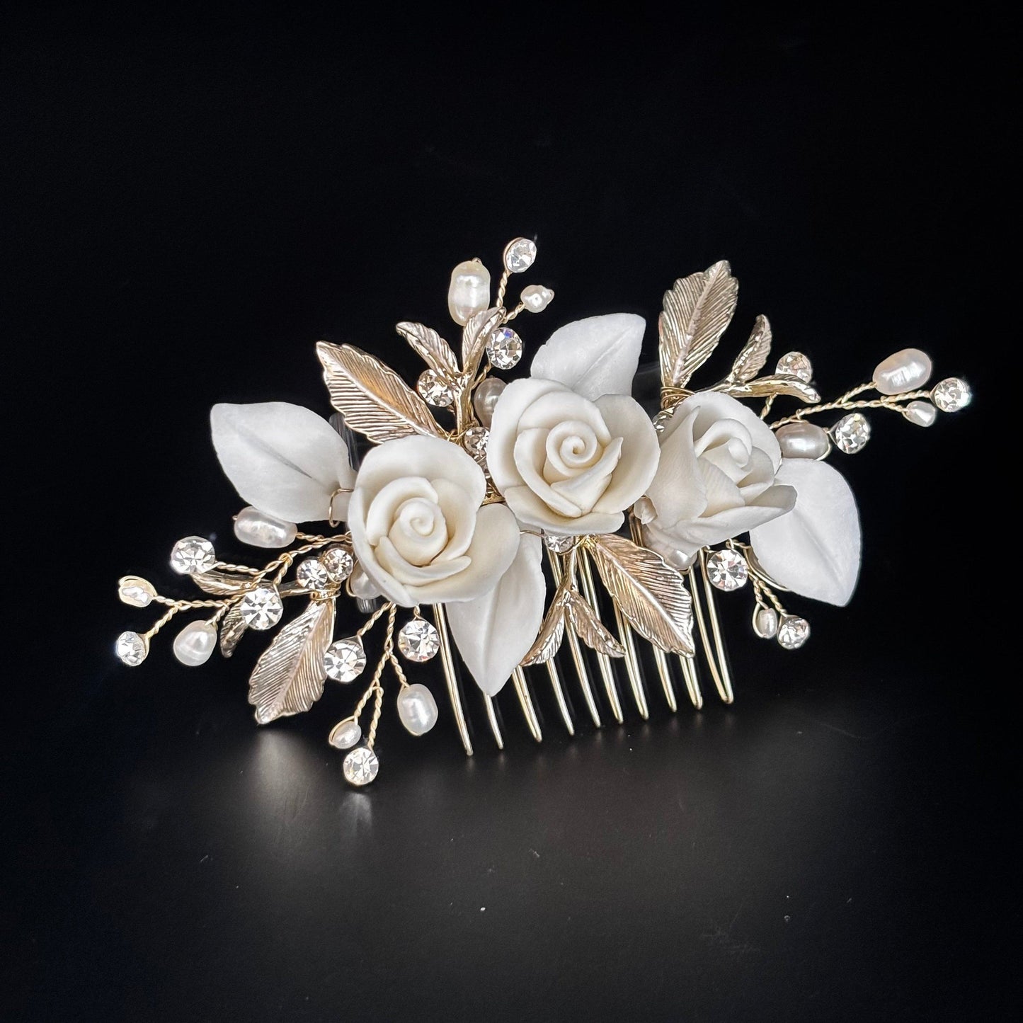 This delicate bridal hair comb is a beautifully romantic accessory, perfect for brides seeking a timeless, elegant look. Featuring handcrafted ivory ceramic roses and leaves, shimmering crystals, and dainty pearl accents, it is set on a base of intricately detailed light champagne gold leaves and branches. The soft floral design and subtle sparkle make it ideal for weddings of all styles—from classic to boho. Whether tucked into an updo or nestled in soft curls, this comb adds a graceful, feminine finishing touch to any bridal hairstyle.