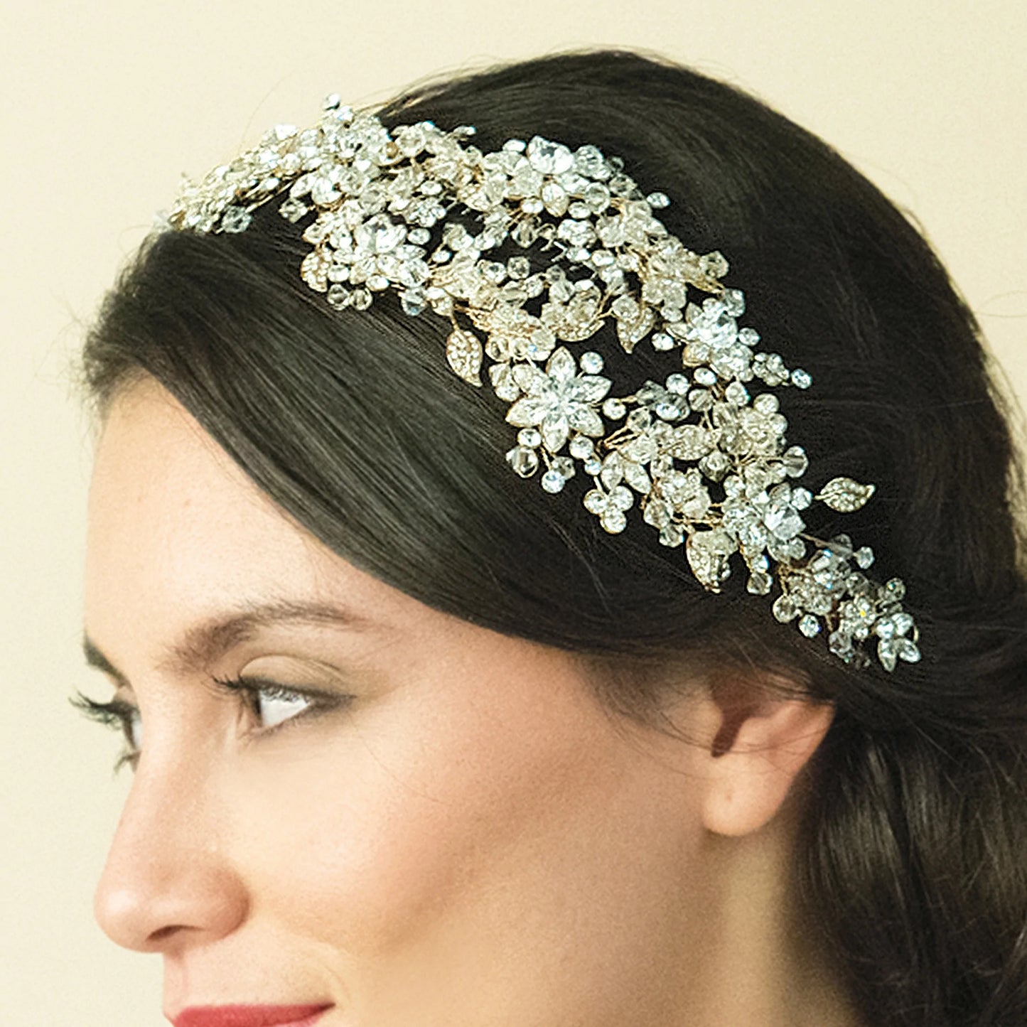 Fallon is a truly stunning bridal hair comb. It has been created using sparkling solitaire cut stones set in a wave of blossom petals interspersed with an array of dazzling cut crystal beads. This beautiful statement headdress is slightly curved to sit against the head properly and can be worn on the side, top or back of the head making it a very versatile design. Perfect for brides wanting an impressive bridal headpiece but with a delicate and feminine design. Looks particularly beautiful when paired with a lace wedding gown.