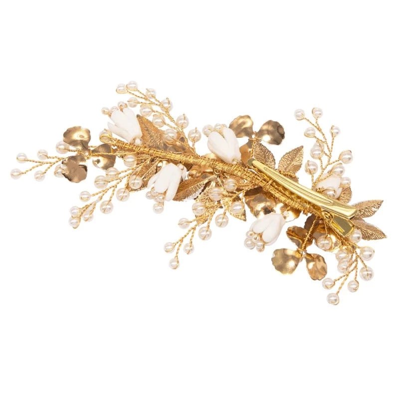 This beautiful bridal headdress will certainly bring the magic to your bridal look with its enchanting blush pink porcelain flowers of beauty. Delicate frangipani blooms hold court surrounded by a galaxy of lustrous seed pearls and sparkling marquise cut crystal Leaves. Intricately hand wired on to a crocodile clip to easily secure into your bridal hair style. A beautiful gold floral bridal headpiece to add that finishing touch to your perfect day.
