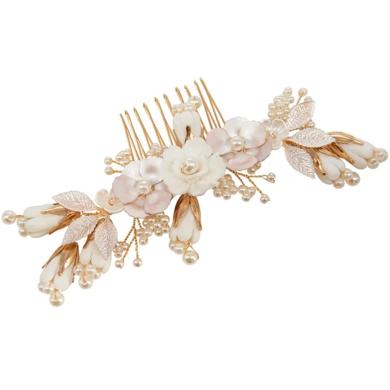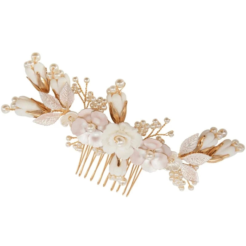 This gorgeous bridal headdress has an adornment of luscious pearls and gold encrusted porcelain flowers brings a breathtaking femininity to your wedding day. The fire and radiance of gold and blush pink porcelain flowers frames the luminous aura of romantic pearls culminating in a sumptuous wave of romantic elegance. A beautiful delicate bridal hair comb to complete your bridal look for your special day.