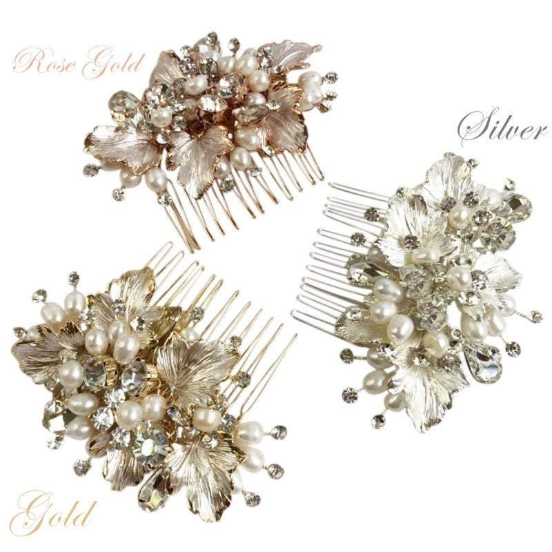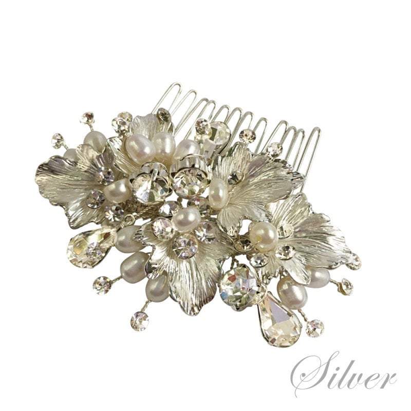 Pearl and Crystal Wedding Hair Comb, Headdress, Silver, Gold or Rose Gold 1889,1887,1885-Silver