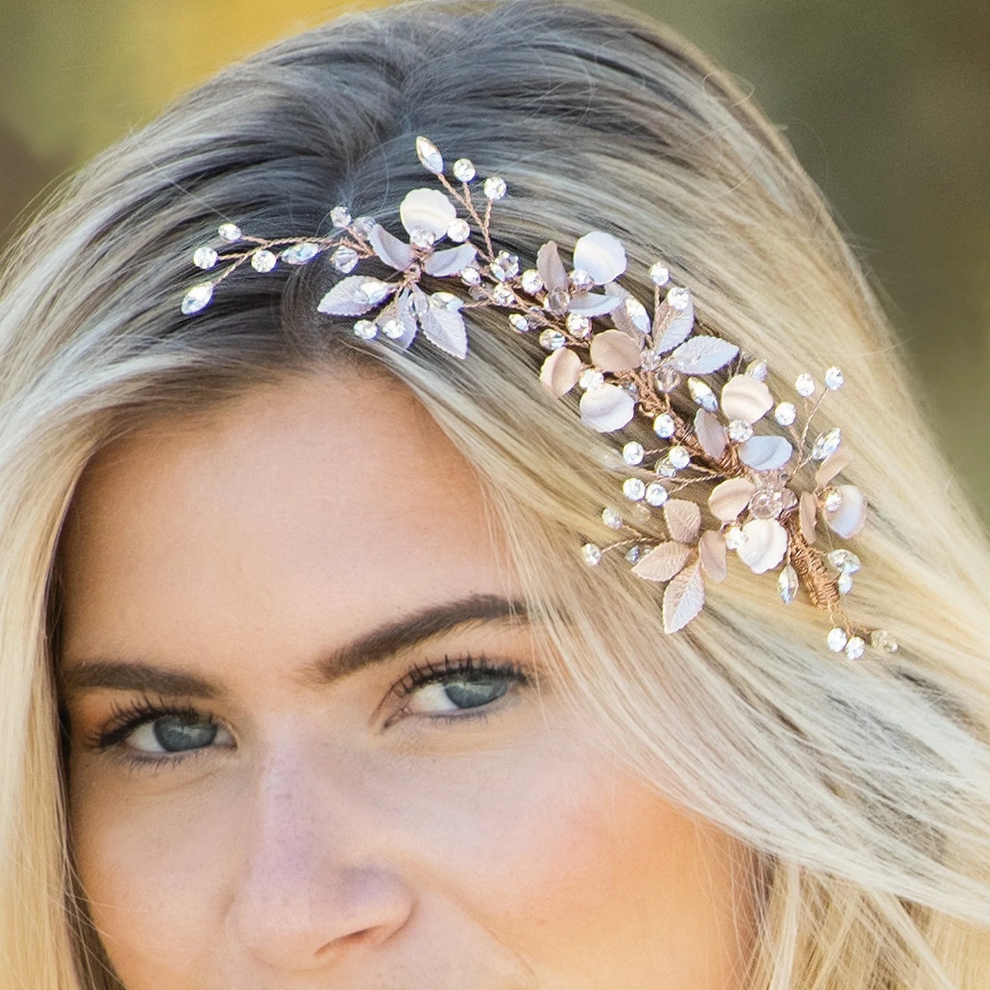 A beautiful delicate bridal hair clip and so feminine in its design. Created with solitaire and marquise cut stones and dainty hand enamelled leaves and petals. This beautiful bridal headpiece set in an interwoven vine pattern in a special flexible metal to allow for comfort. This stunning hairpiece can be worn at the side or back of the head and is ideal for brides or bridesmaids wanting a very delicate headpiece. It works particularly well for beach and garden weddings or a bohemian themed look.