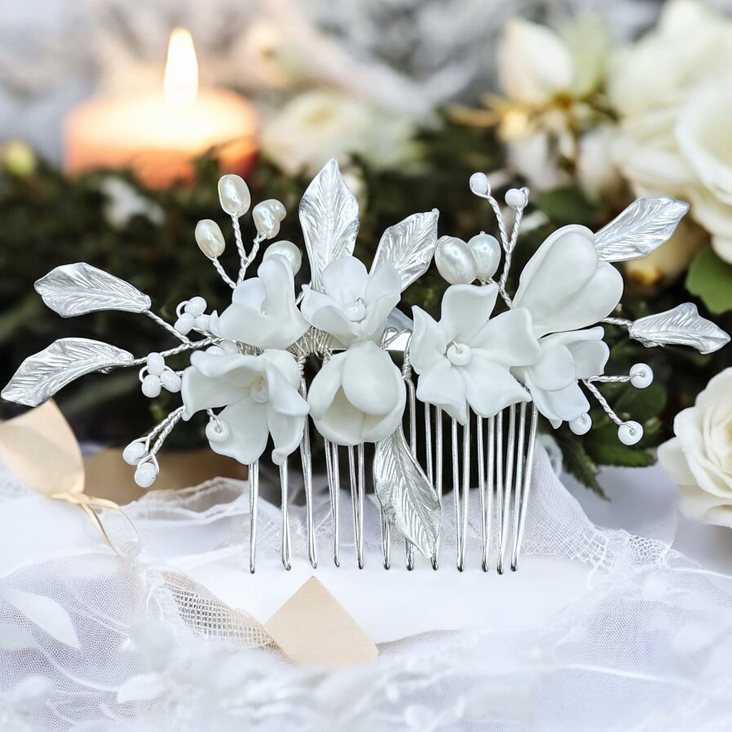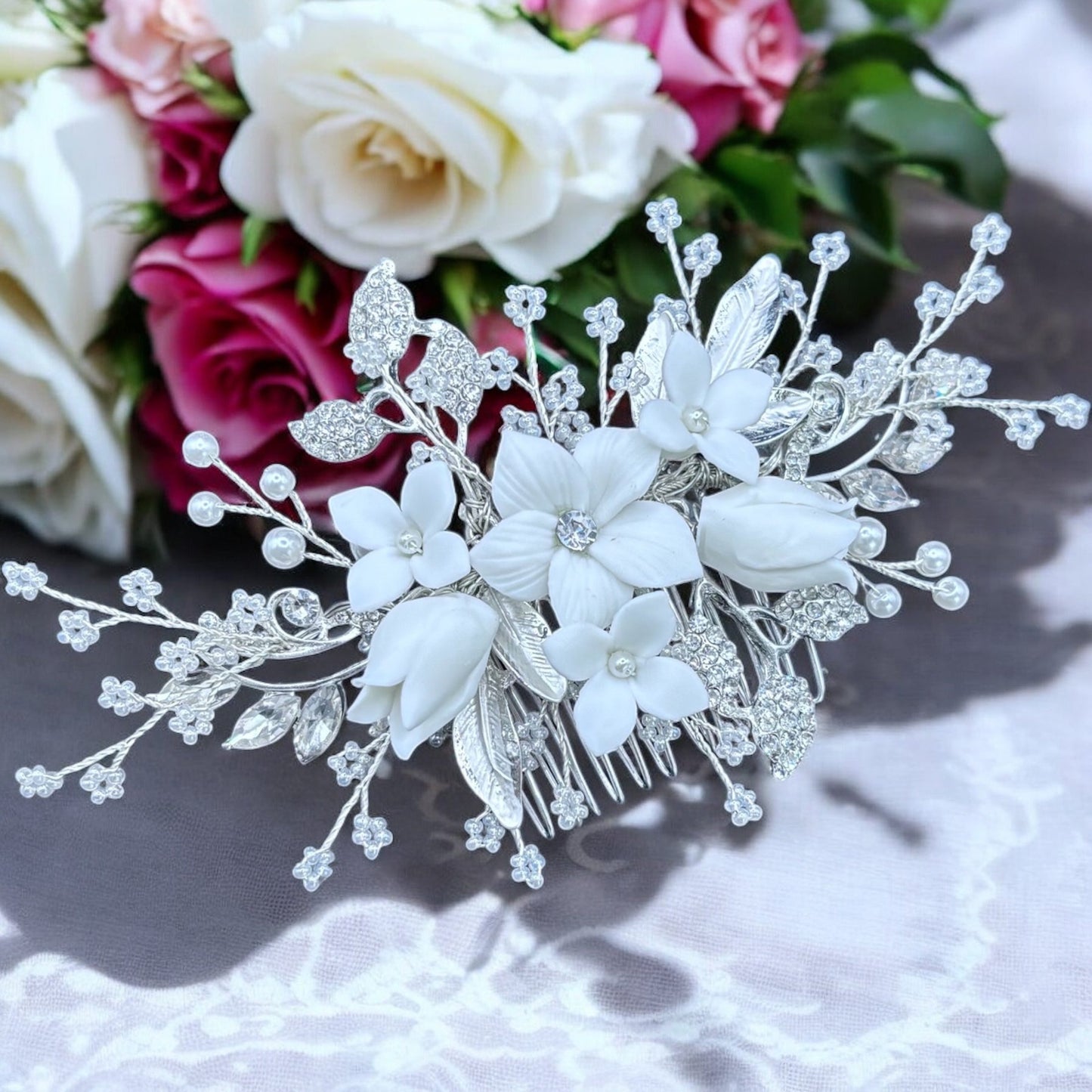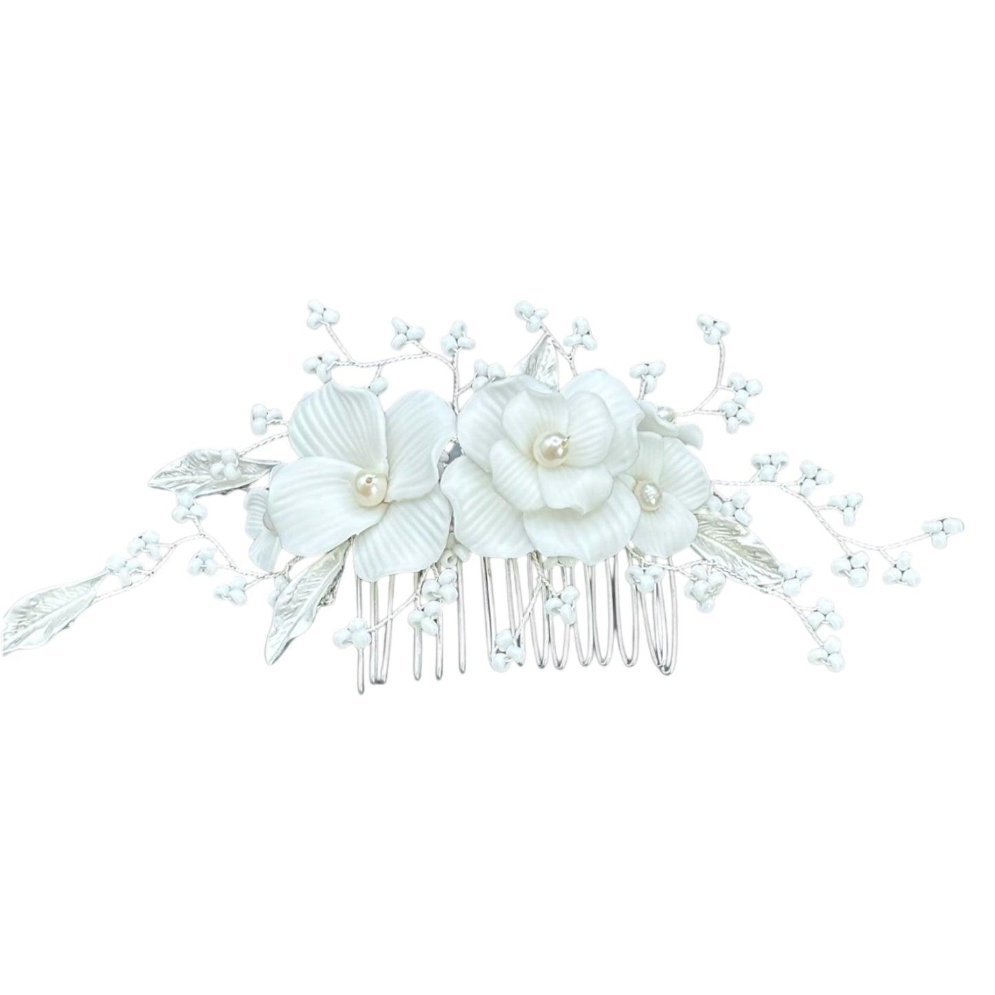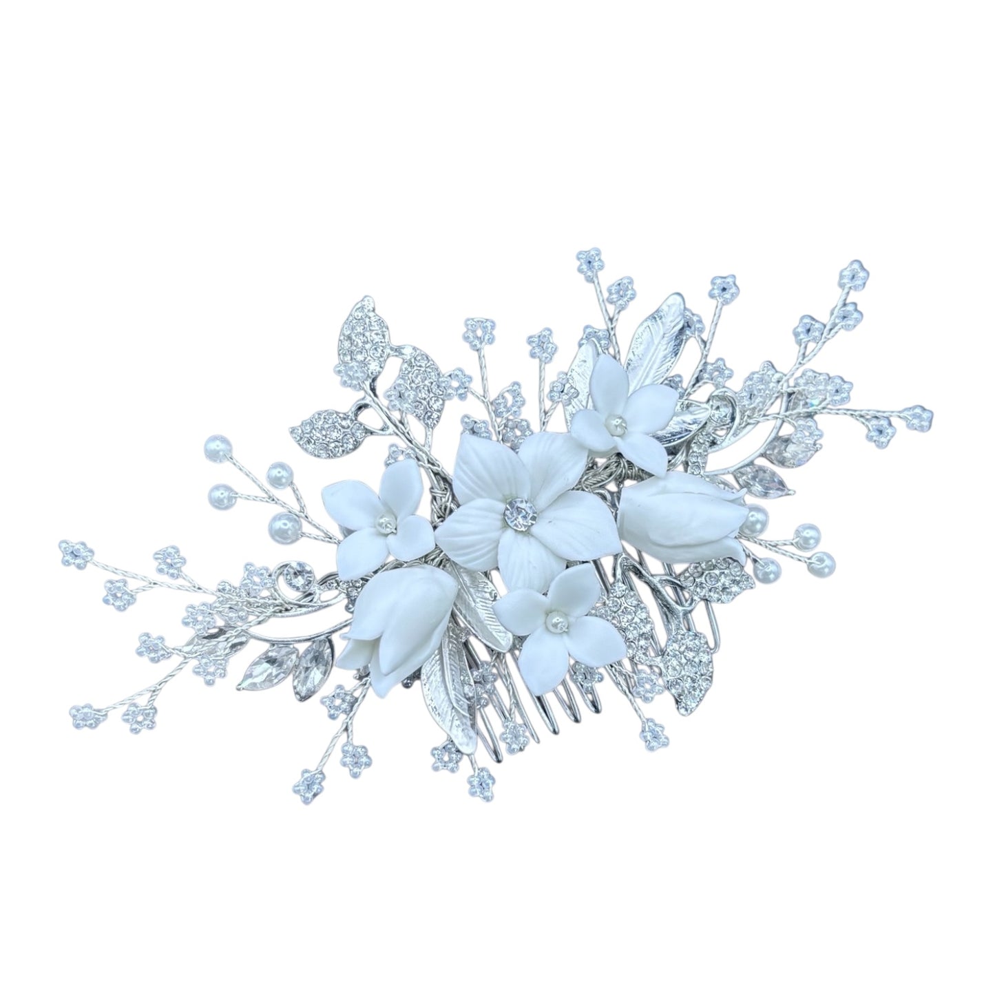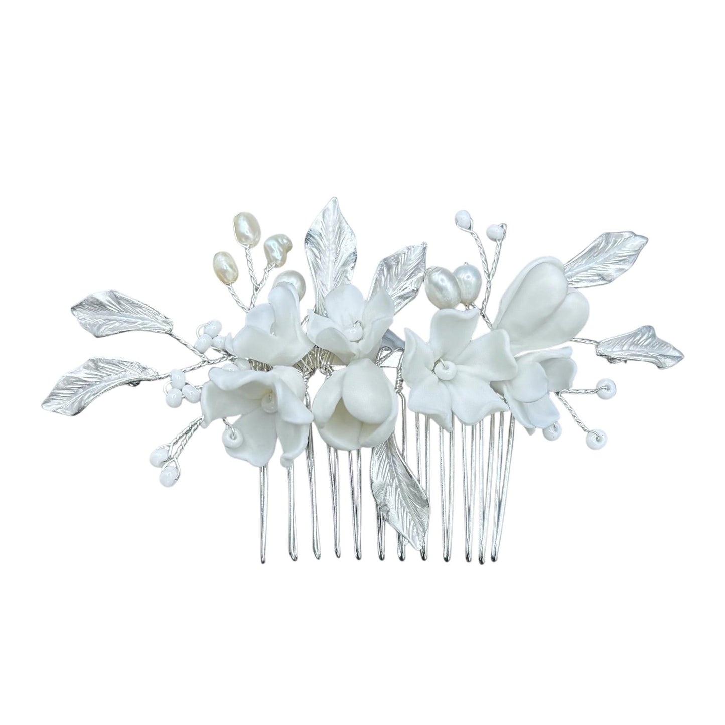 Add Silver Bridal Hair Comb Embellished with Florals and Pearls TT1077 to the cart