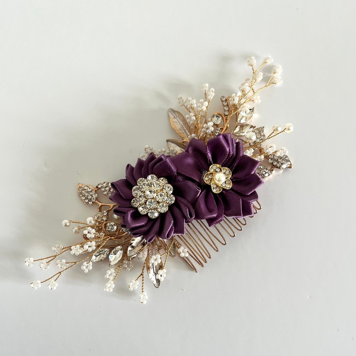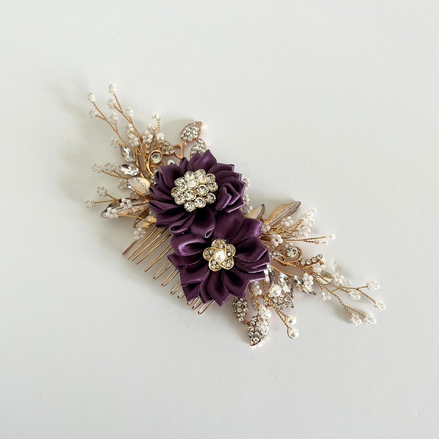Gold bridal hair comb with purple crystals and ivory pearls