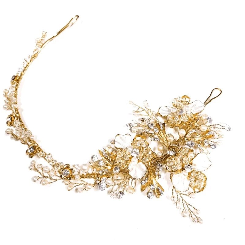 Regular price £63.75A beautiful Gold Crystal Wedding Hair Vine to bring radiance to your bridal style on your special day. This stunning floral hair vine is embellished with glowing crystals, and delicate ivory pearls, amongst Metallic gold leaves. The intensely set crystal work is offset beautifully by a sparkly gold vine. This gold crystal Wedding hair vine is perfect for celebrating a match made in heaven.