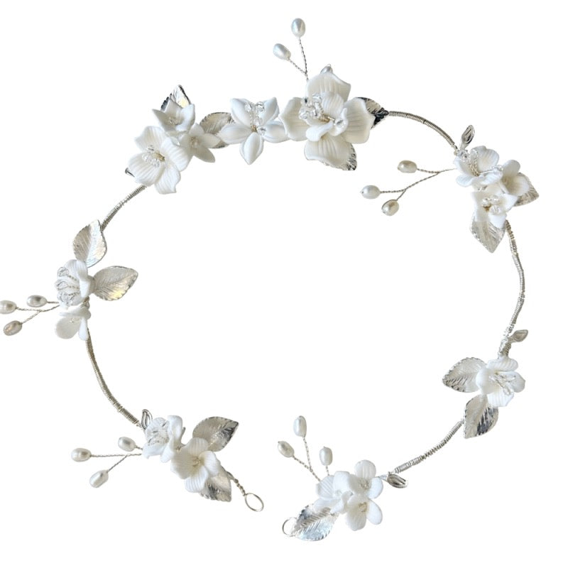Indulge in the exquisite Silver Bridal Hair Vine with Flowers and Ivory Pearl. A stunning piece meticulously handcrafted with silver-plated wire, it exudes an air of sophistication and elegance. Embodying a blend of clay flowers, Grecian leaves, and simulated ivory pearls, this hair vine is truly a work of art. Every element is carefully placed to create a visually stunning accessory that will elevate your bridal look. Infused with whimsy and romance from the clay flowers, and timeless charm from the Grecian leaves, it is finished with a touch of opulence and glamour from the simulated ivory pearls. With endless possibilities, this versatile hair vine can be worn as a headband, hair accessory, or a delicate accent to your veil, completing your unique and personalized wedding day style.