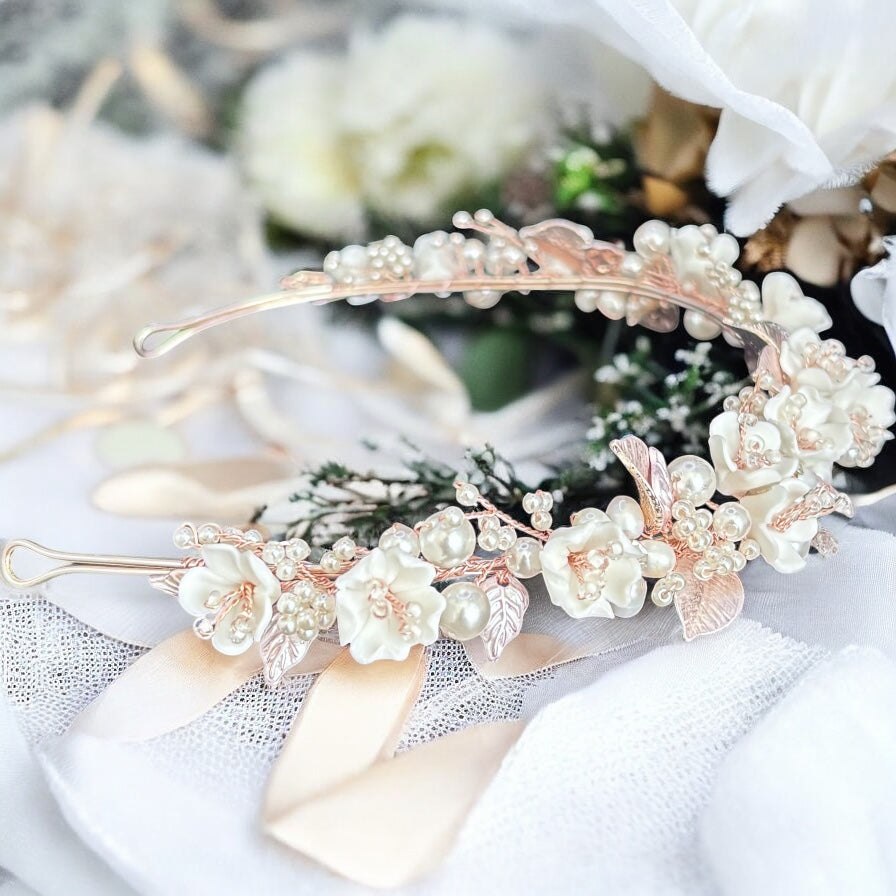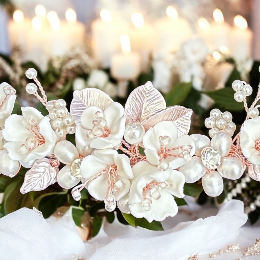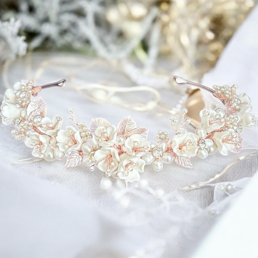 This stunning bridal headdress is designed for brides who desire a touch of elegance and romance on their wedding day. Featuring delicate floral details, shimmering pearls, and intricately crafted leaves in a soft light rose gold / pink finish, this headband exudes timeless beauty. Perfect for complementing both classic and modern bridal looks, it adds a graceful, feminine touch to any hairstyle. Ideal for weddings of any season, this headpiece is a dreamy accessory that will make brides feel truly radiant as they walk down the aisle.