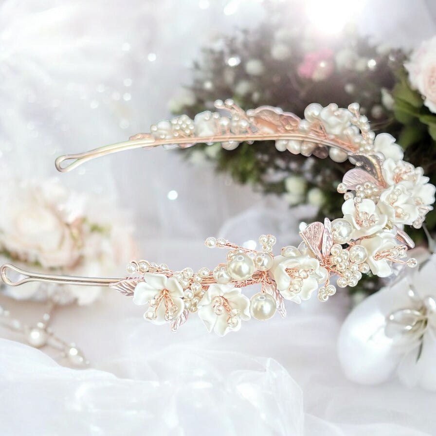 Rose Gold Floral Bridal Headband with Crystals and Pearls TT1059