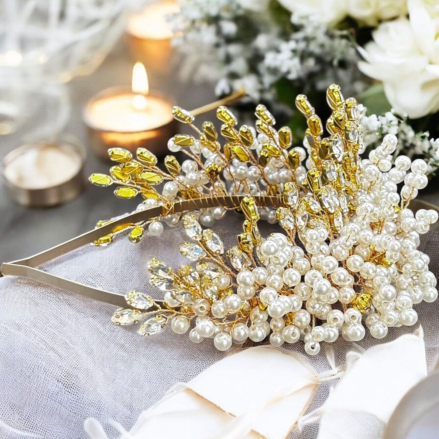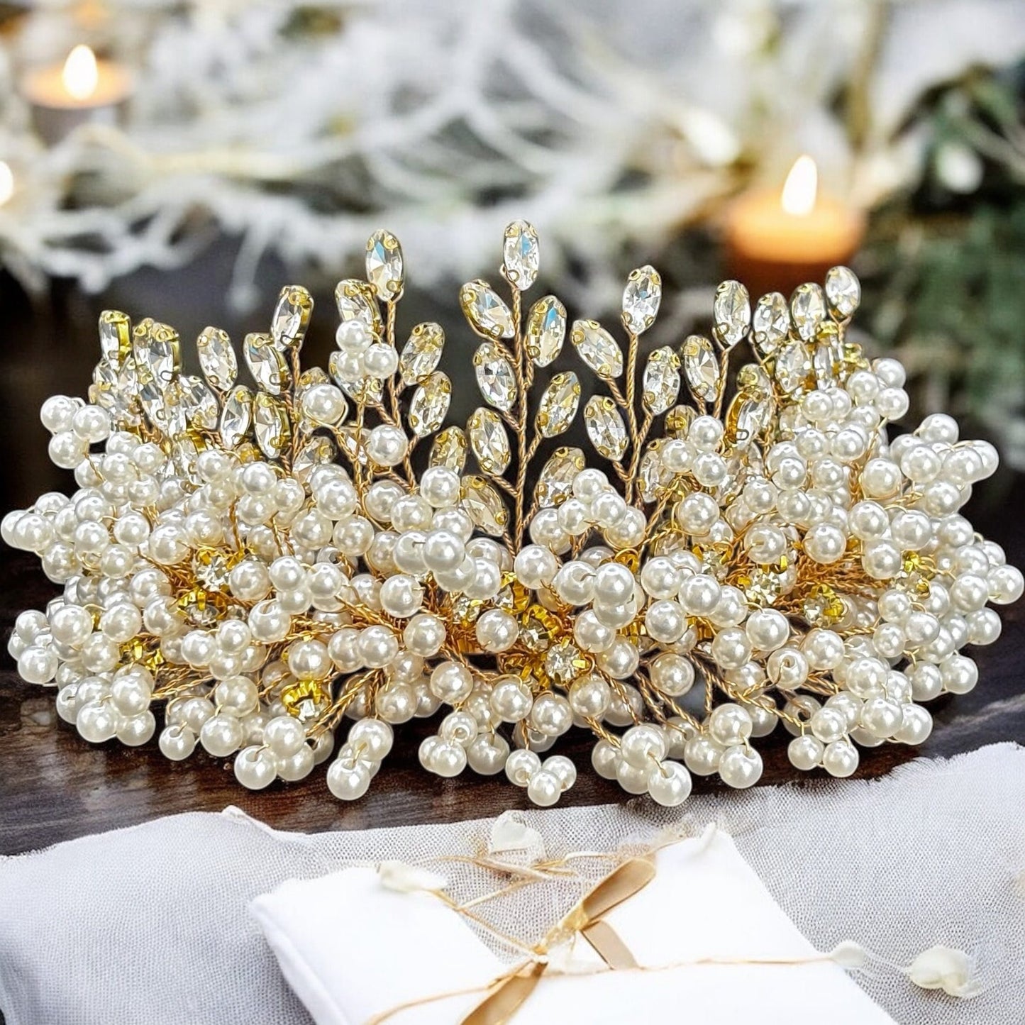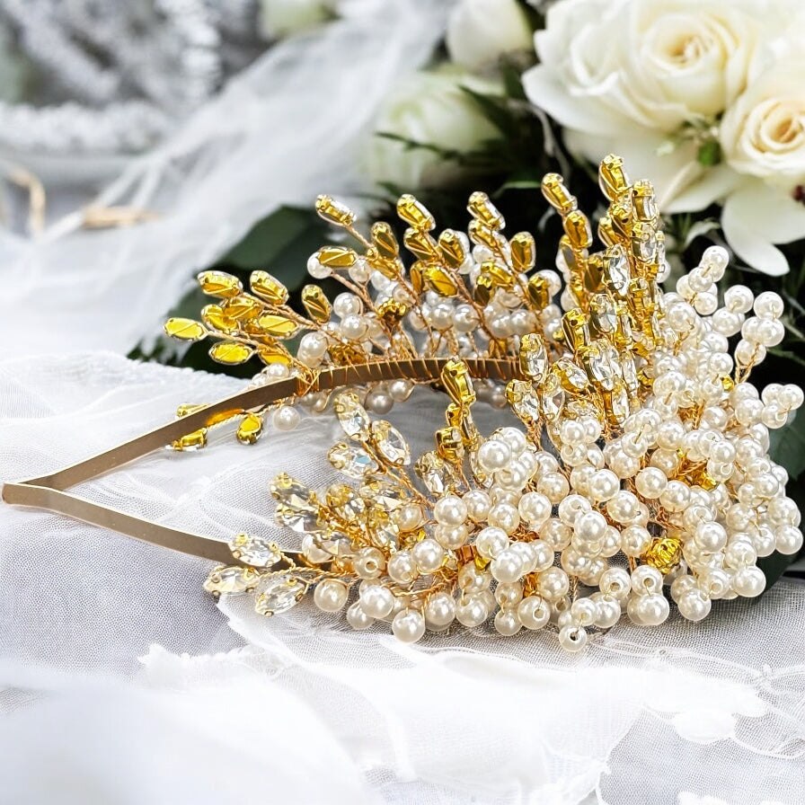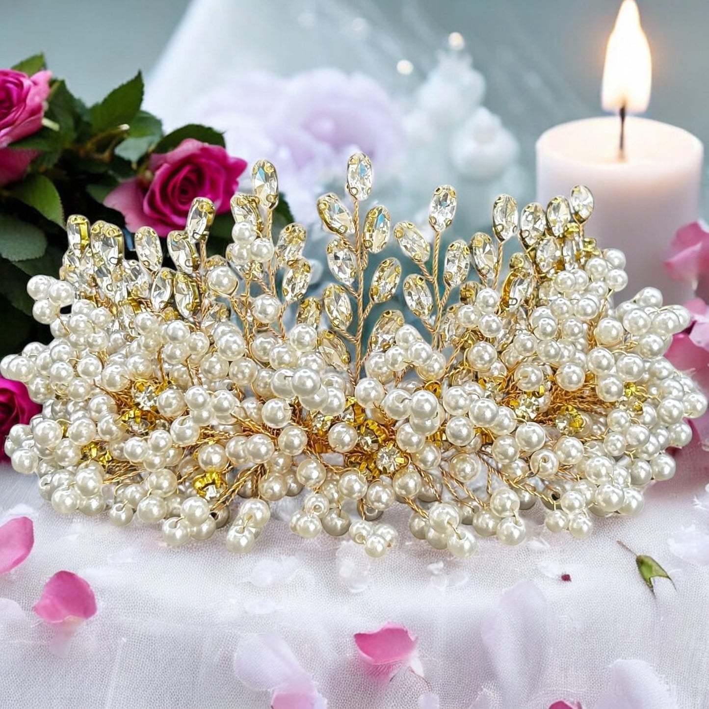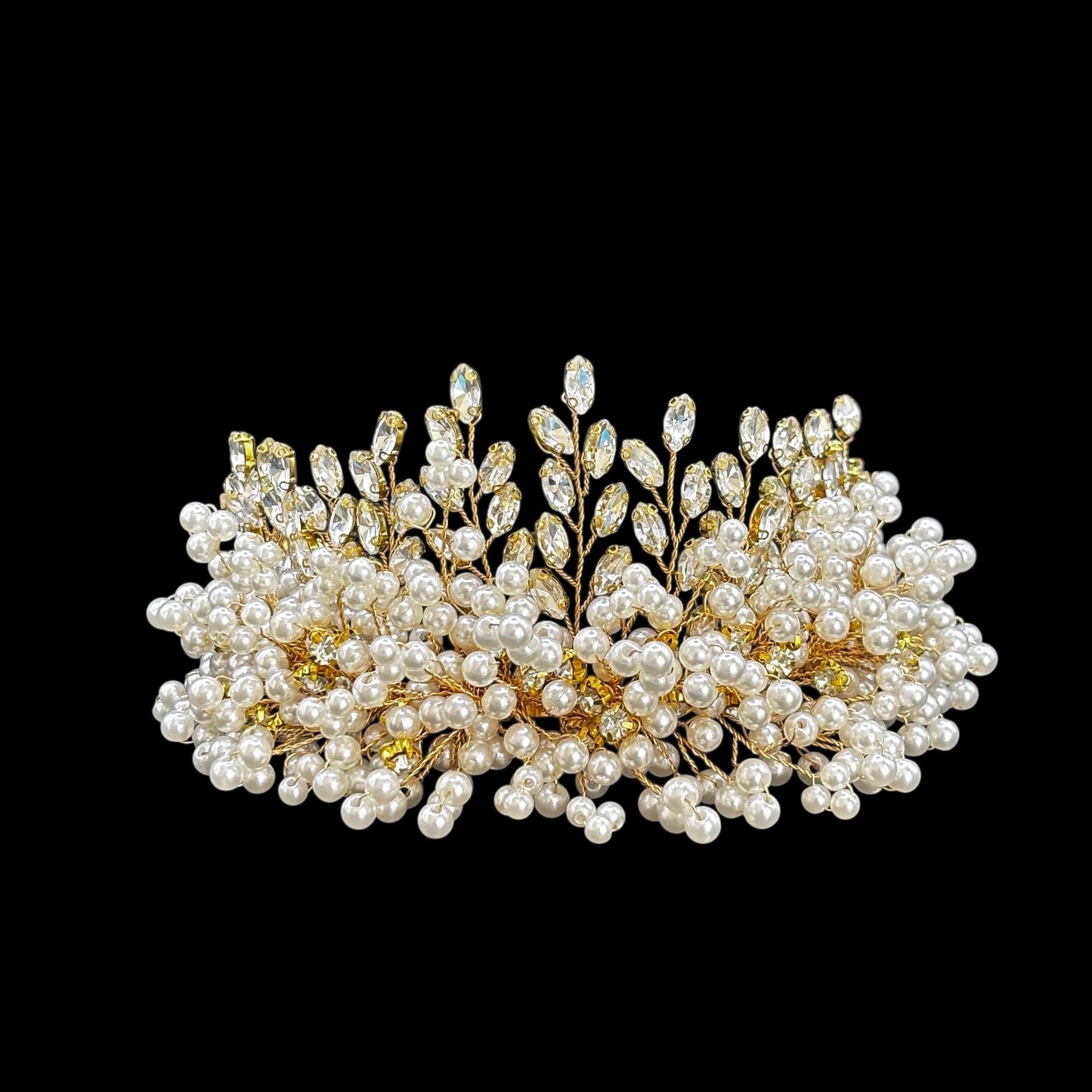Elevate your bridal look with this exquisite handcrafted headpiece. Delicate ivory pearls, and sparkling crystals create an enchanting and elegant accessory for your special day. Embrace luxurious beauty and sophistication with each step down the aisle. The harmonious combination of lustrous pearls and brilliant crystals set against a refined gold framework creates a symphony of light that enhances your natural radiance. Meticulously crafted with attention to every detail, this versatile bridal headdress adapts beautifully to various hairstyles and wedding gown aesthetics. The lightweight yet secure design ensures comfortable wear from ceremony to reception, while its heirloom quality makes it a treasured keepsake of your momentous occasion.