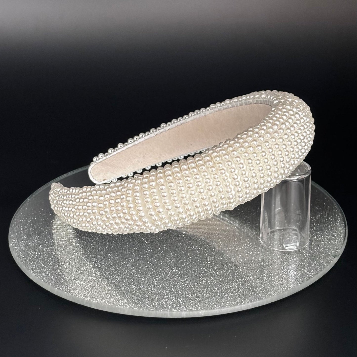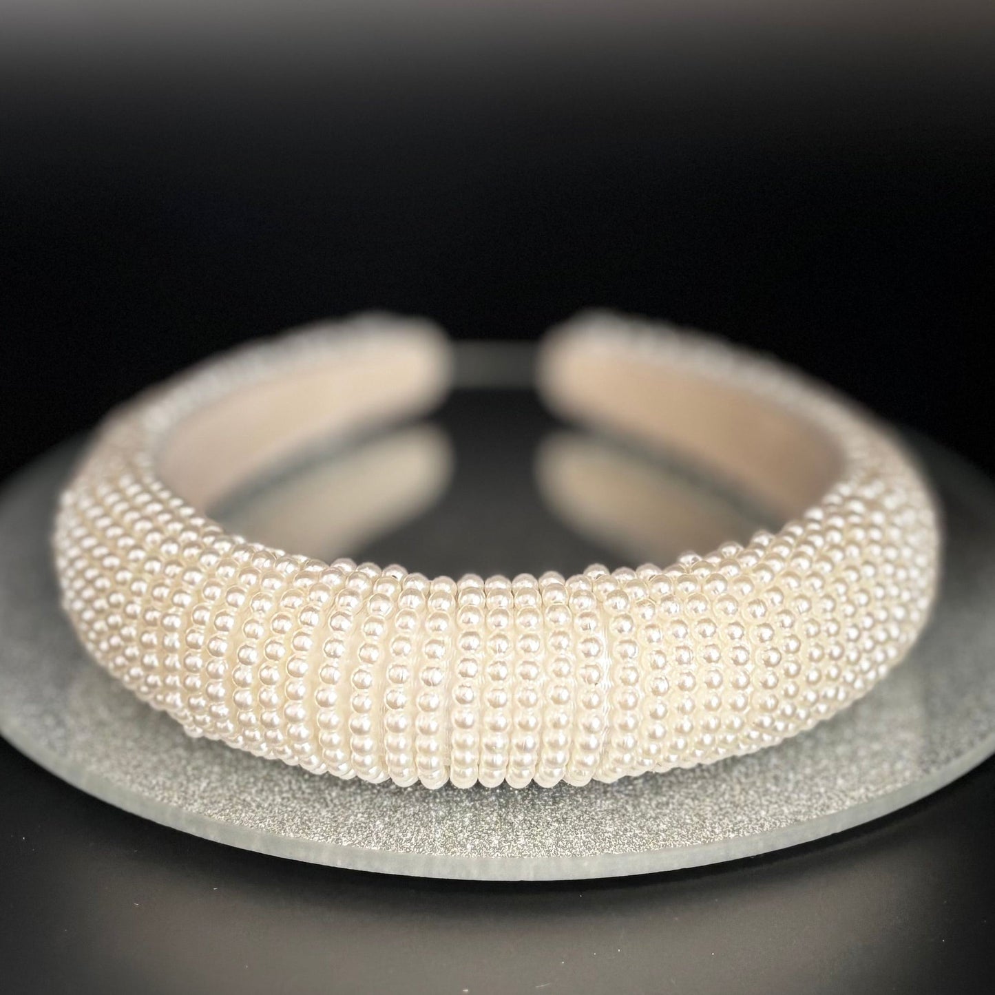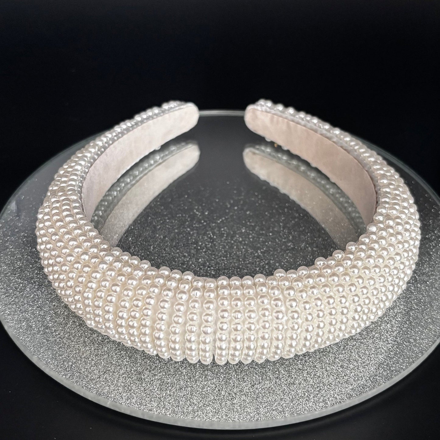 Enhance your bridal appearance on your special day with our Ivory Pearl Bridal Headband. Handcrafted in luxurious satin fabric and adorned with simulated ivory pearls. This headpiece has an elegant and sophisticated aesthetic. A stylish wedding accessory that adds an artful touch of refinement to your ensemble.