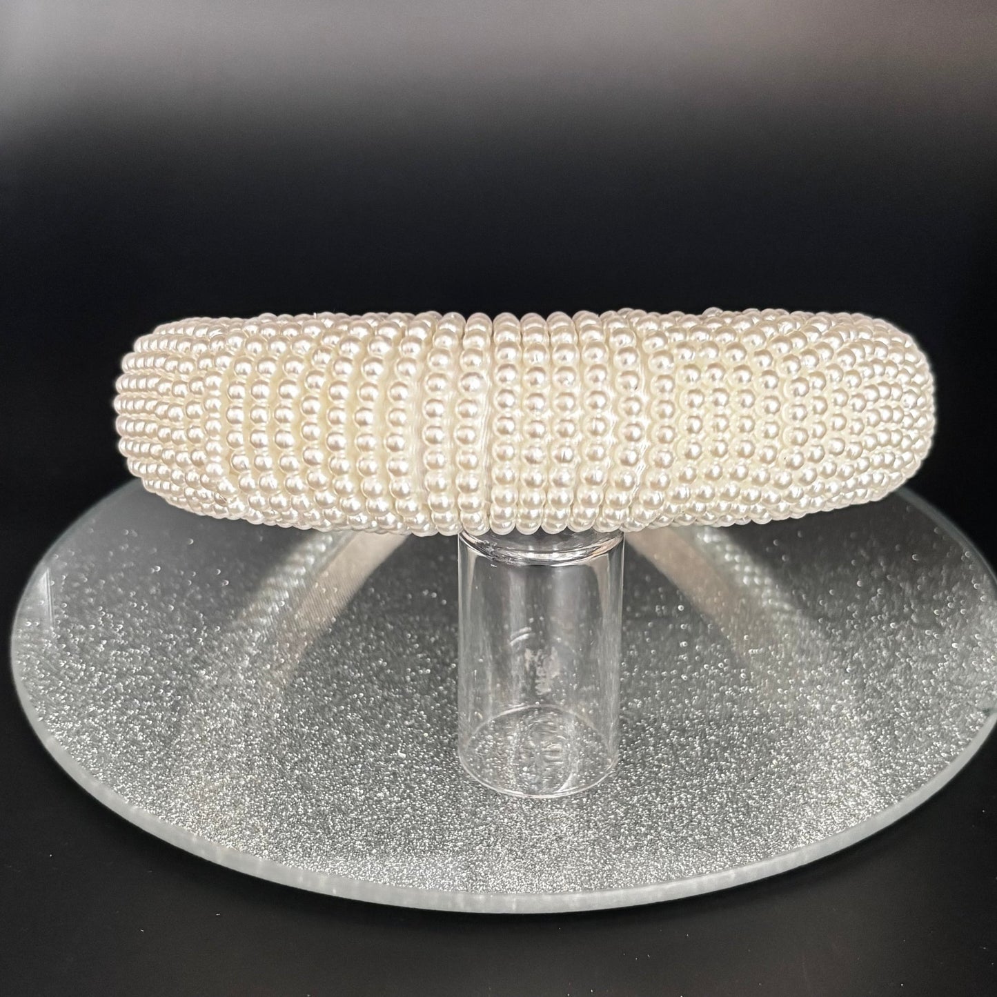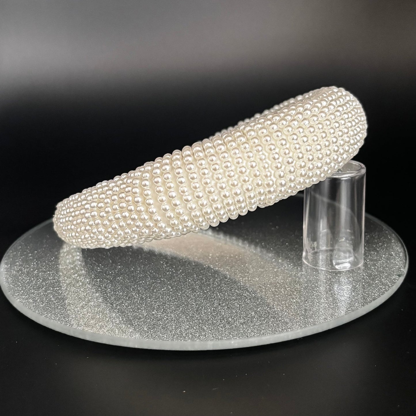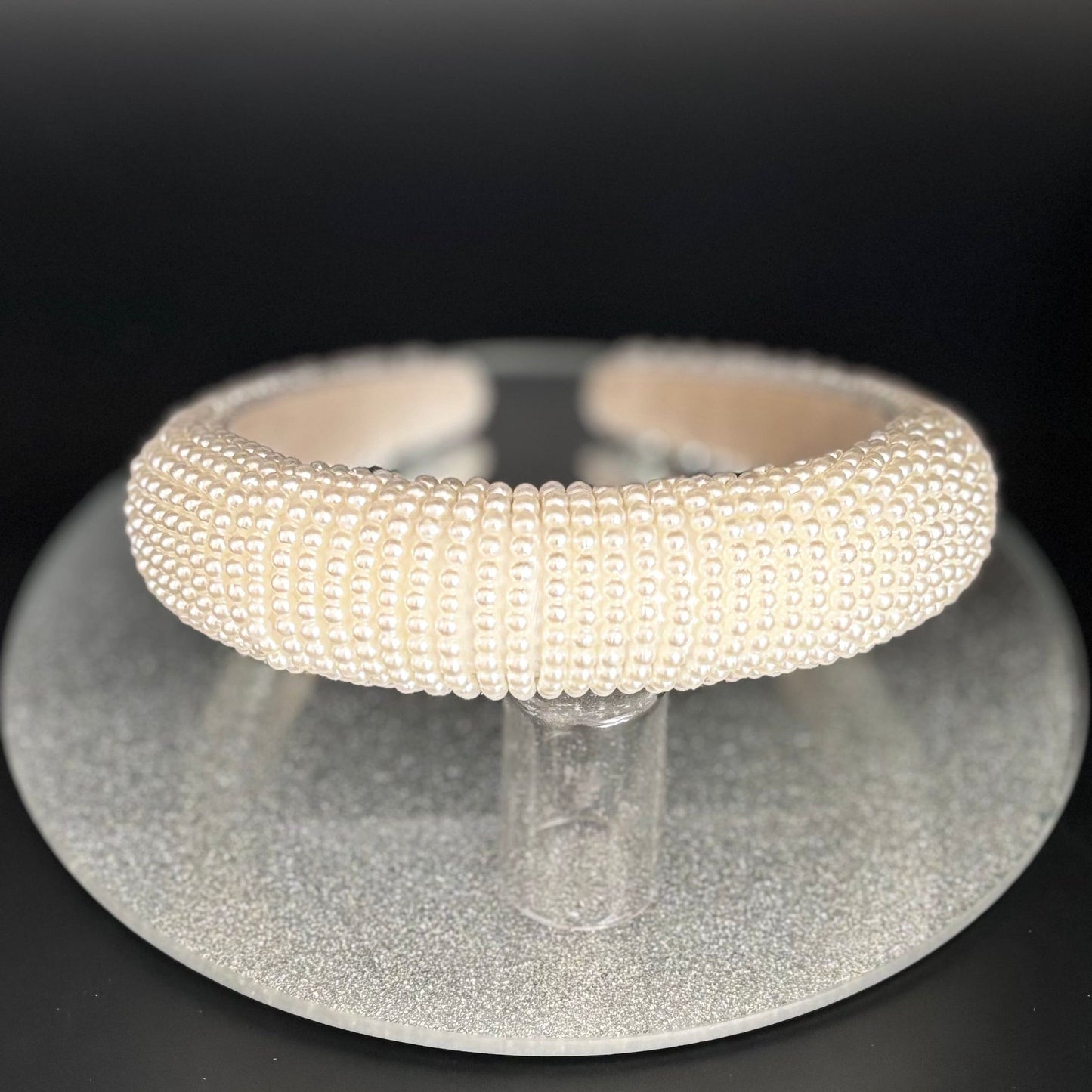Enhance your bridal appearance on your special day with our Ivory Pearl Bridal Headband. Handcrafted in luxurious satin fabric and adorned with simulated ivory pearls. This headpiece has an elegant and sophisticated aesthetic. A stylish wedding accessory that adds an artful touch of refinement to your ensemble.