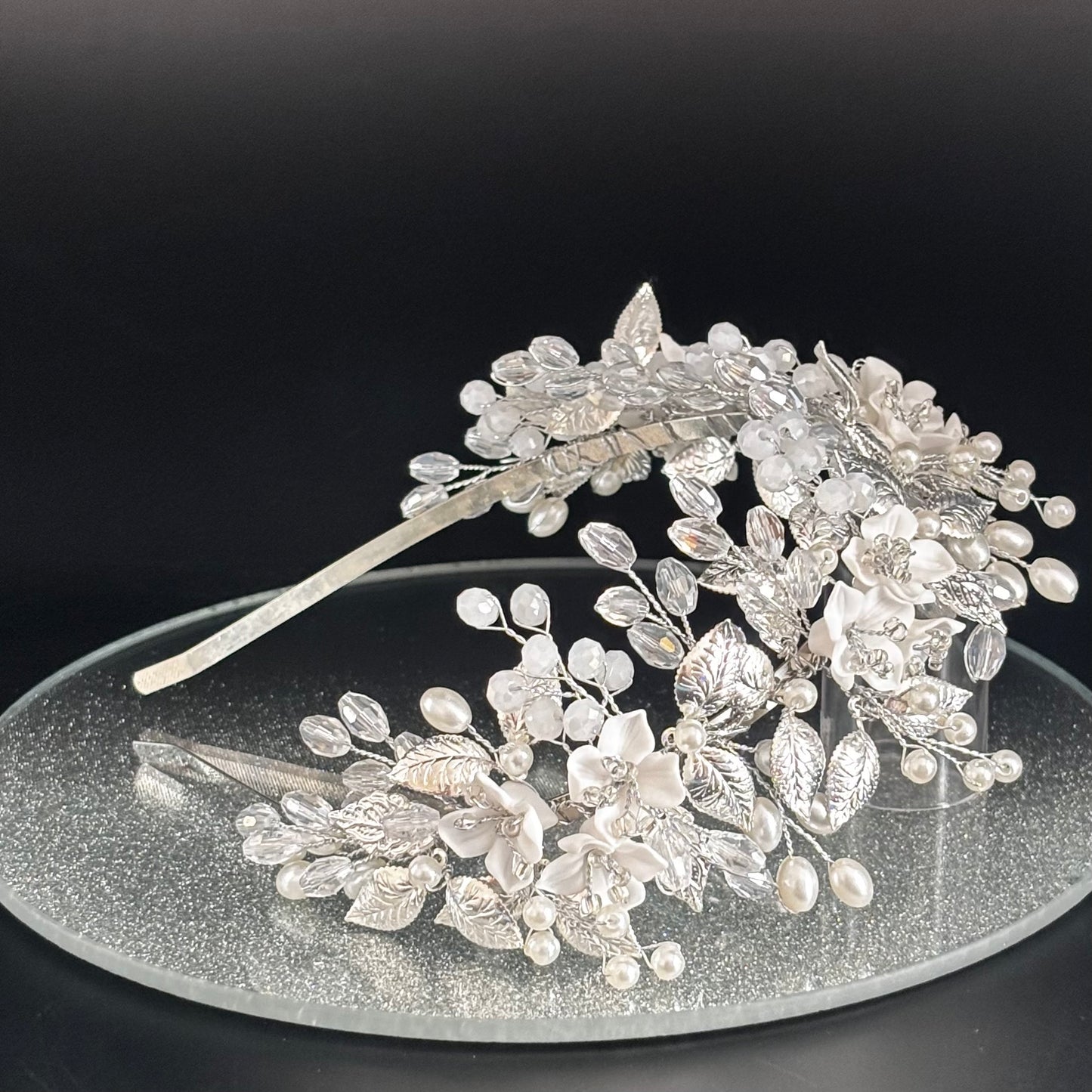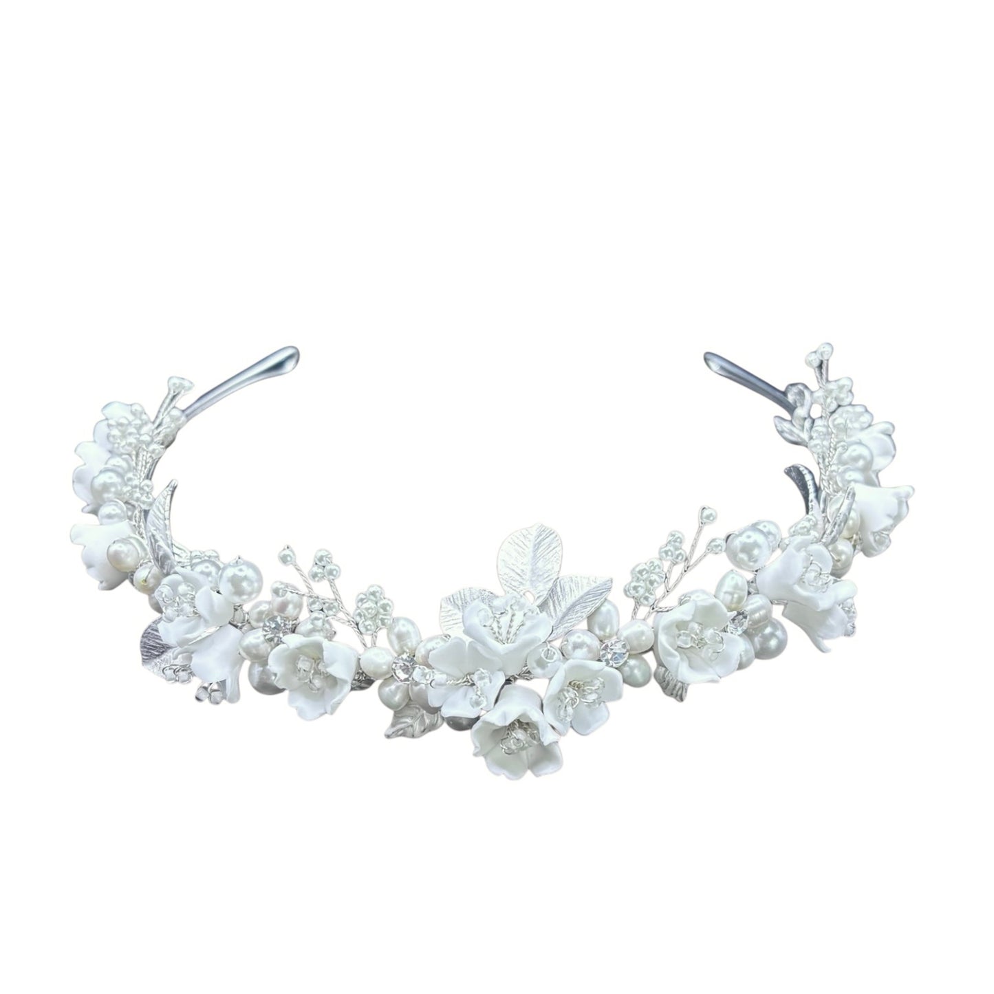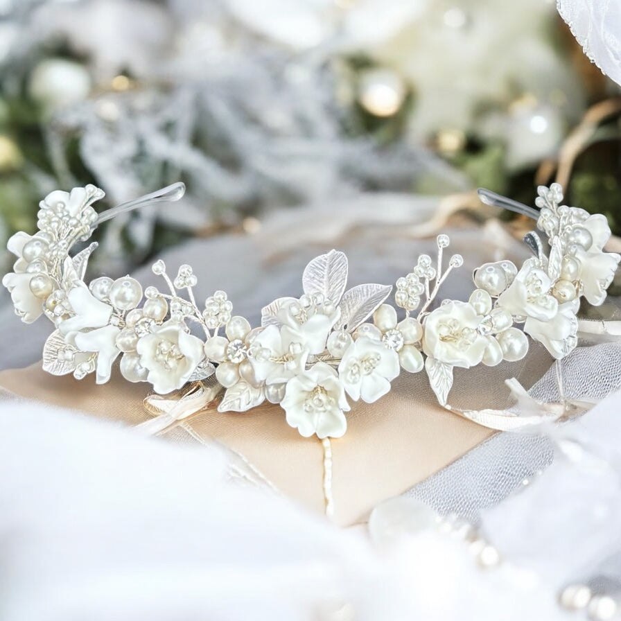 Add Floral Bridal Headband in Silver with Crystals & Pearls, TT1053 to the cart