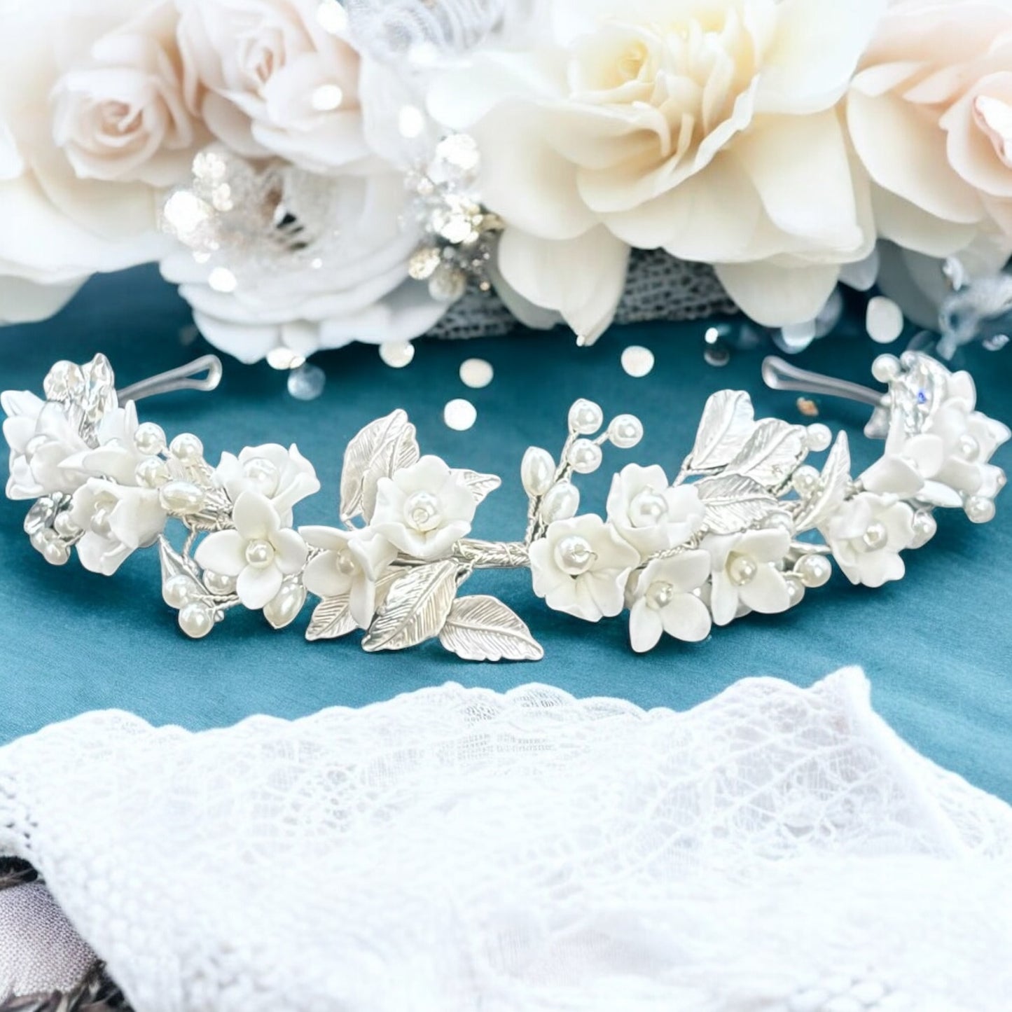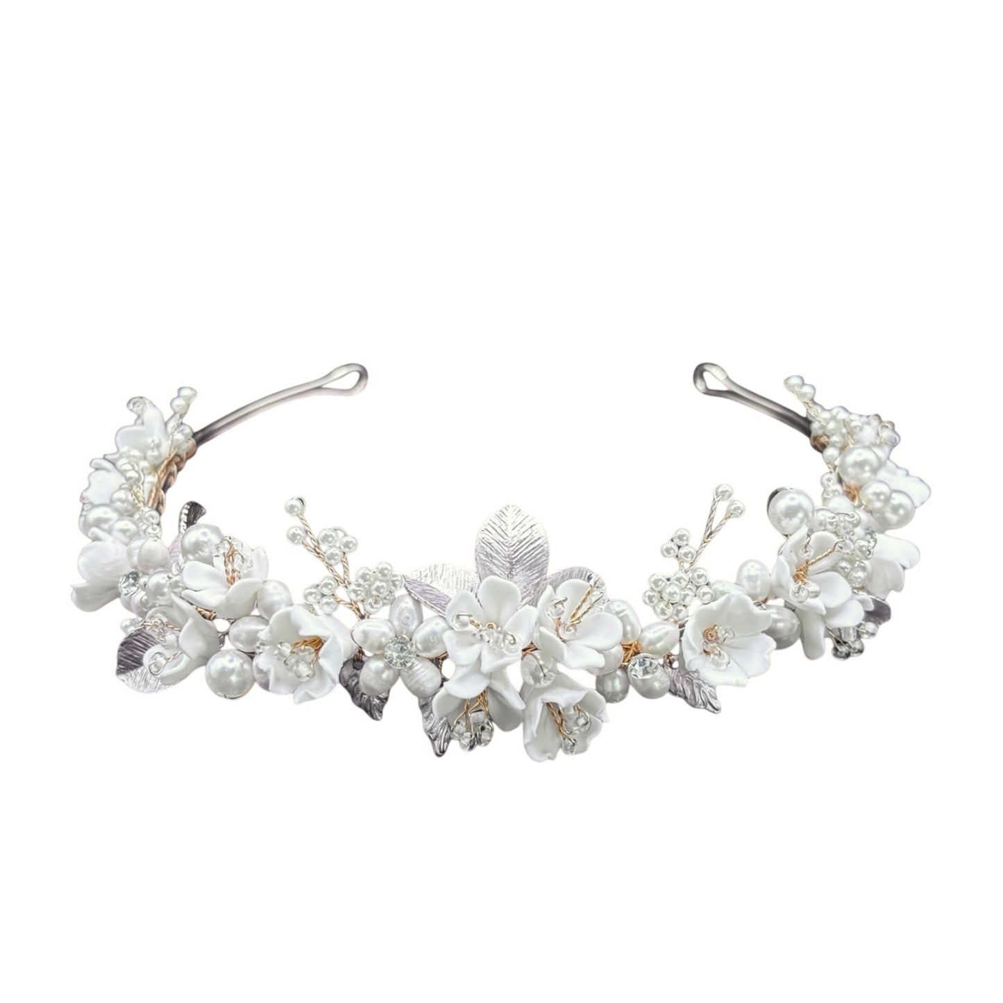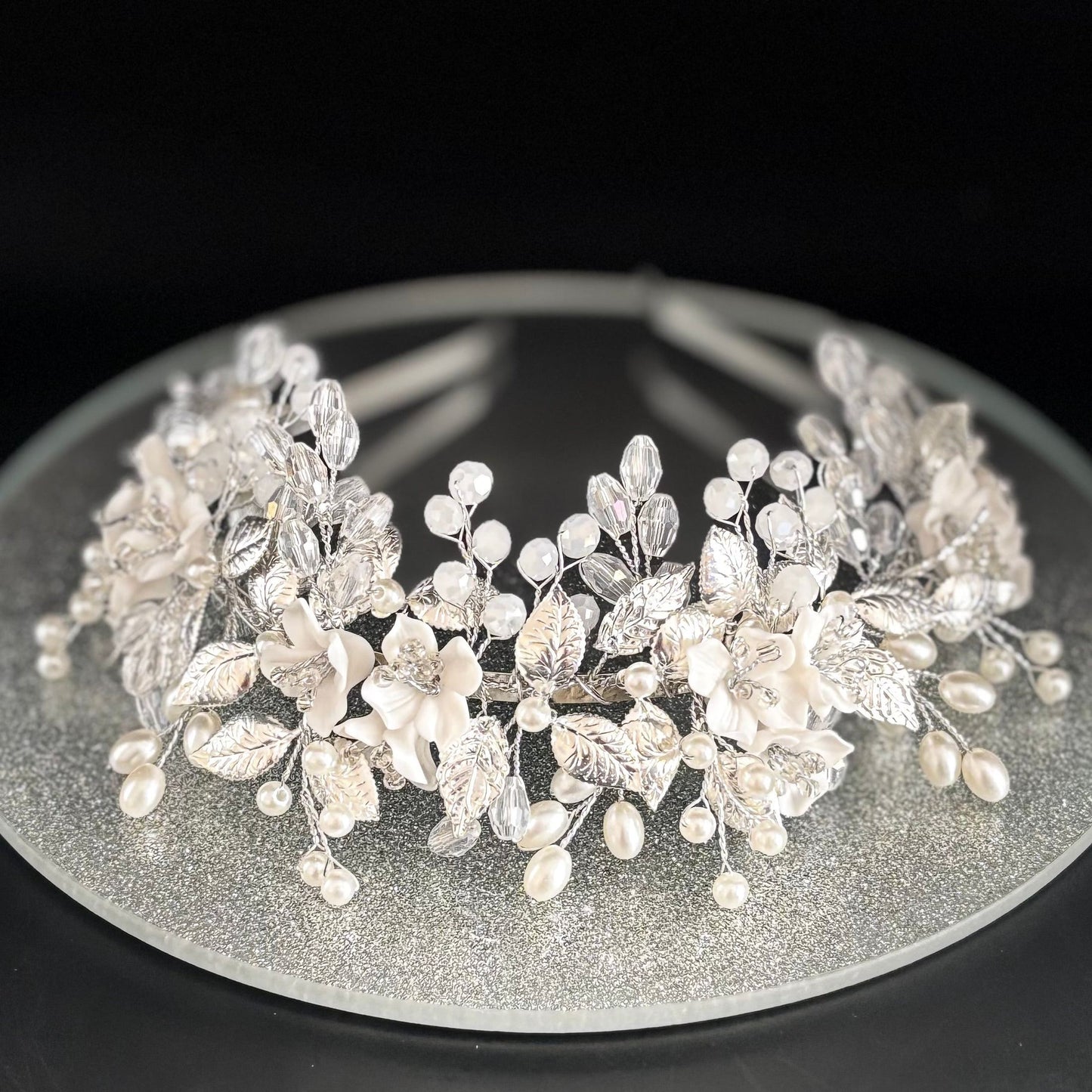 Add Floral Bridal Headband in Silver with Crystals & Pearls, TT1053 to the cart
