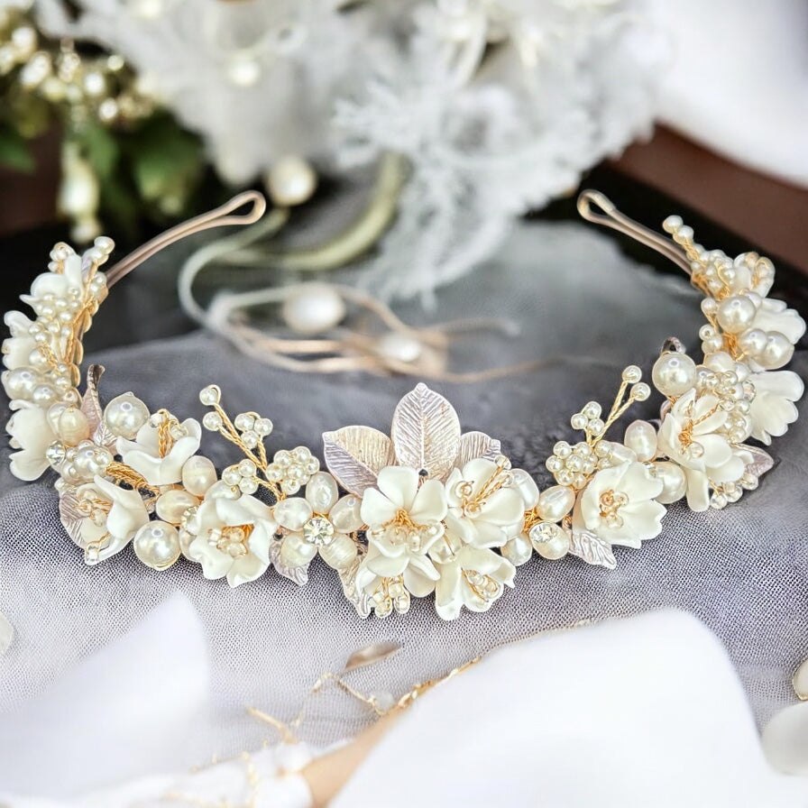 Add Gold Floral Wedding Headband with Crystals & Pearls, TT1051 to the cart