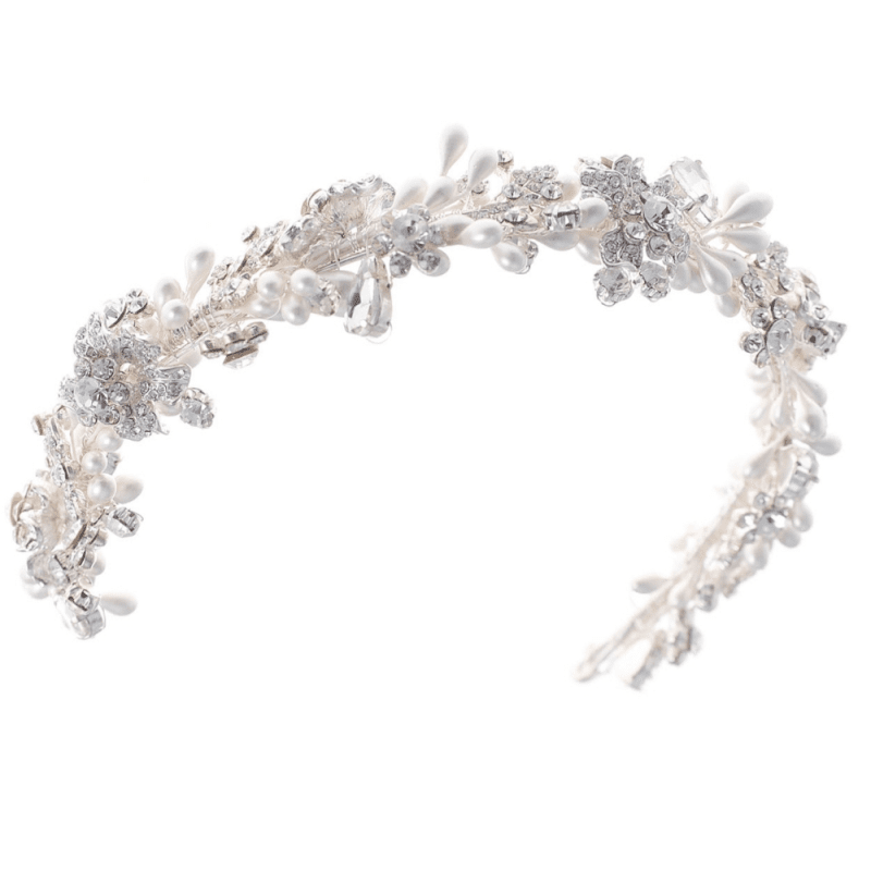 This stunning Bridal Headpiece has been made to the highest standard. Beautifully crystal embellished flowers with simulated ivory pearls and sparkling clear crystals. Set on to a flexible silver headband, making it suitable for many bridal hair styles.