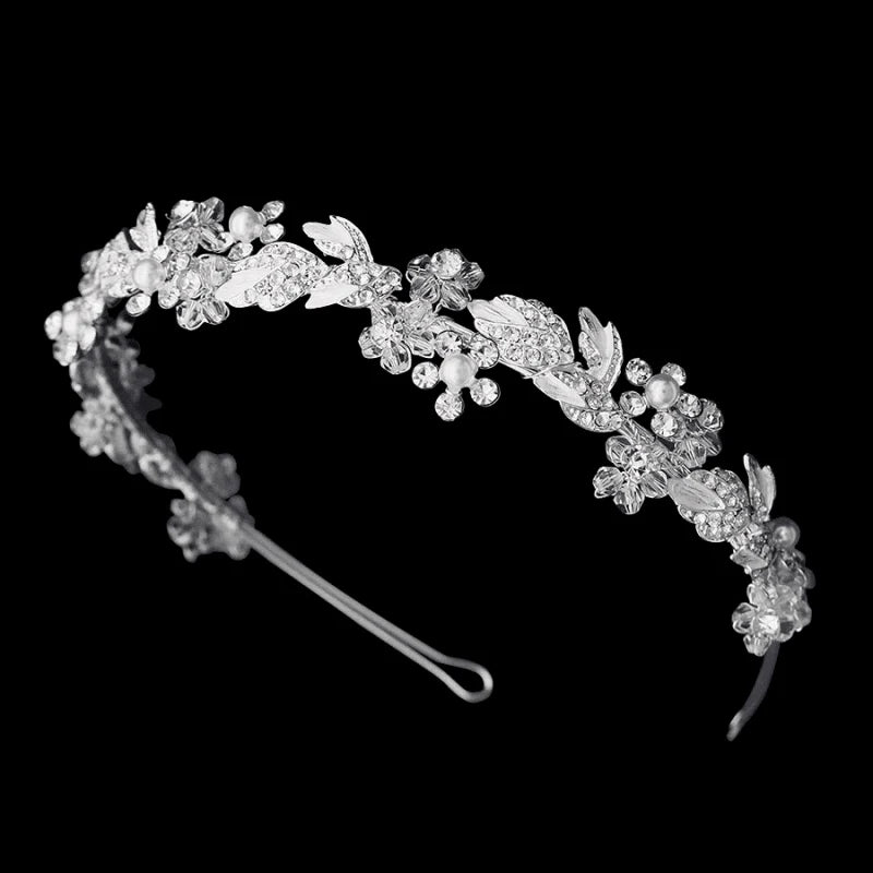 An exquisite Vintage inspired bridal headband encrusted with a bed of delicate crystal embellished flowers, cocooned by a cloud of hand painted leaves, clear cut crystals and crystal drops on a silver finish headband. The crystals on this beautiful headpiece twinkle and sparkle as they catch the light. The elegant simplicity of this wedding headpiece will add radiance to your special day