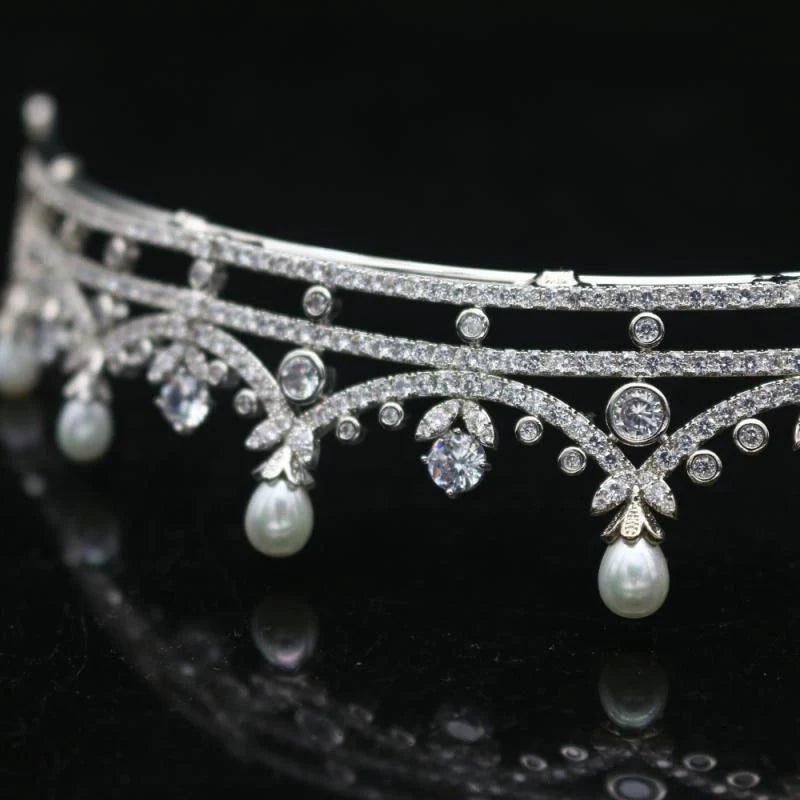 A stunning bridal tiara embellished with high quality clear cubic zirconia crystals and simulated ivory pearls on a silver finish. The sparkling crystals catch the light at every angle ensuring that you bewitch and bedazzle on your magical wedding day. Such a beautiful tiara to complete your bridal look.