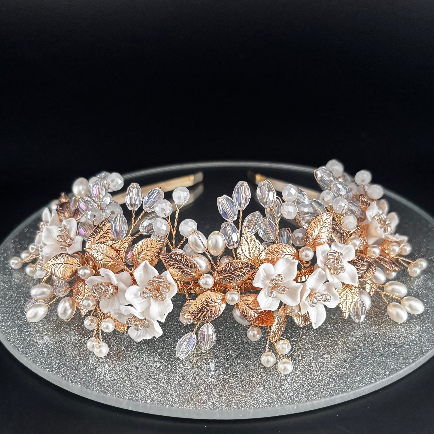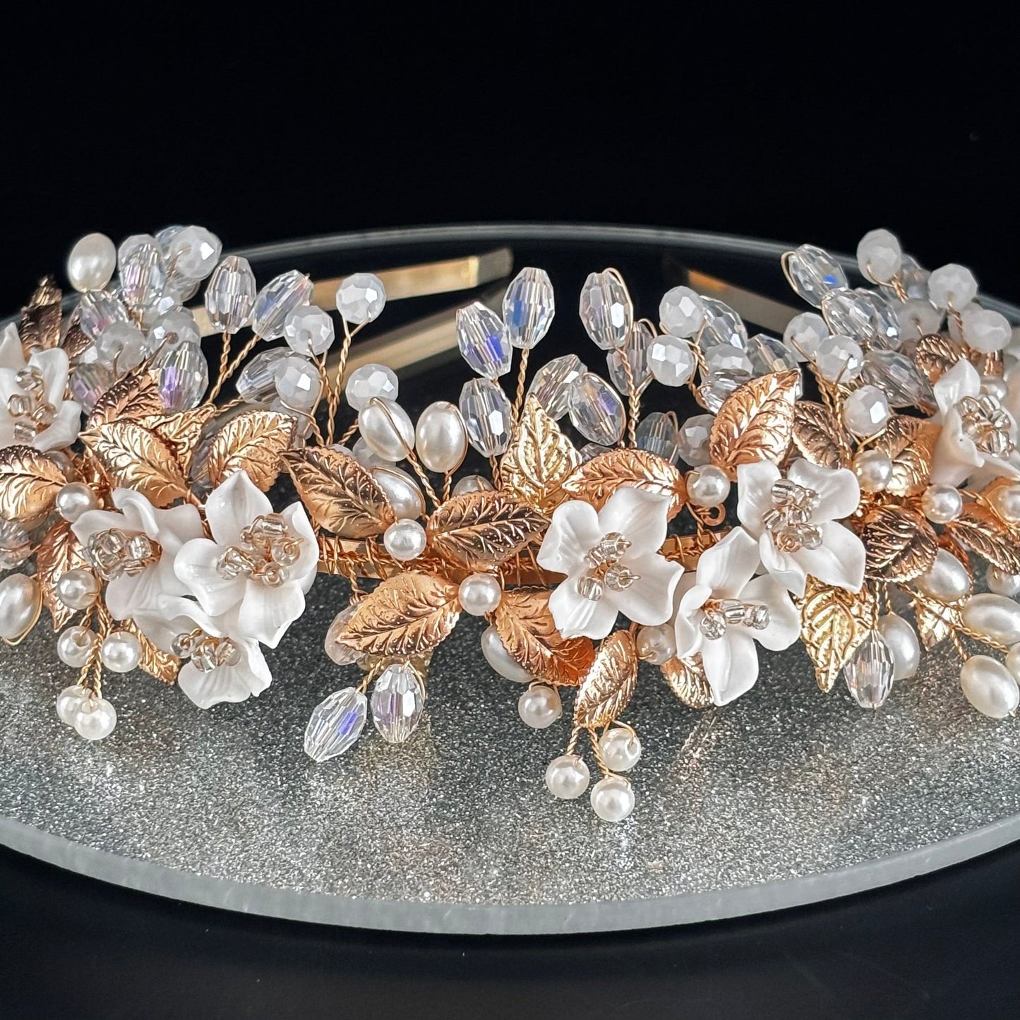 Elevate your bridal look with an exquisite handcrafted floral headpiece. Delicate porcelain flowers, ivory pearls, and sparkling crystals create an enchanting and elegant accessory for your special day. Embrace luxurious beauty and sophistication with each step down the aisle.