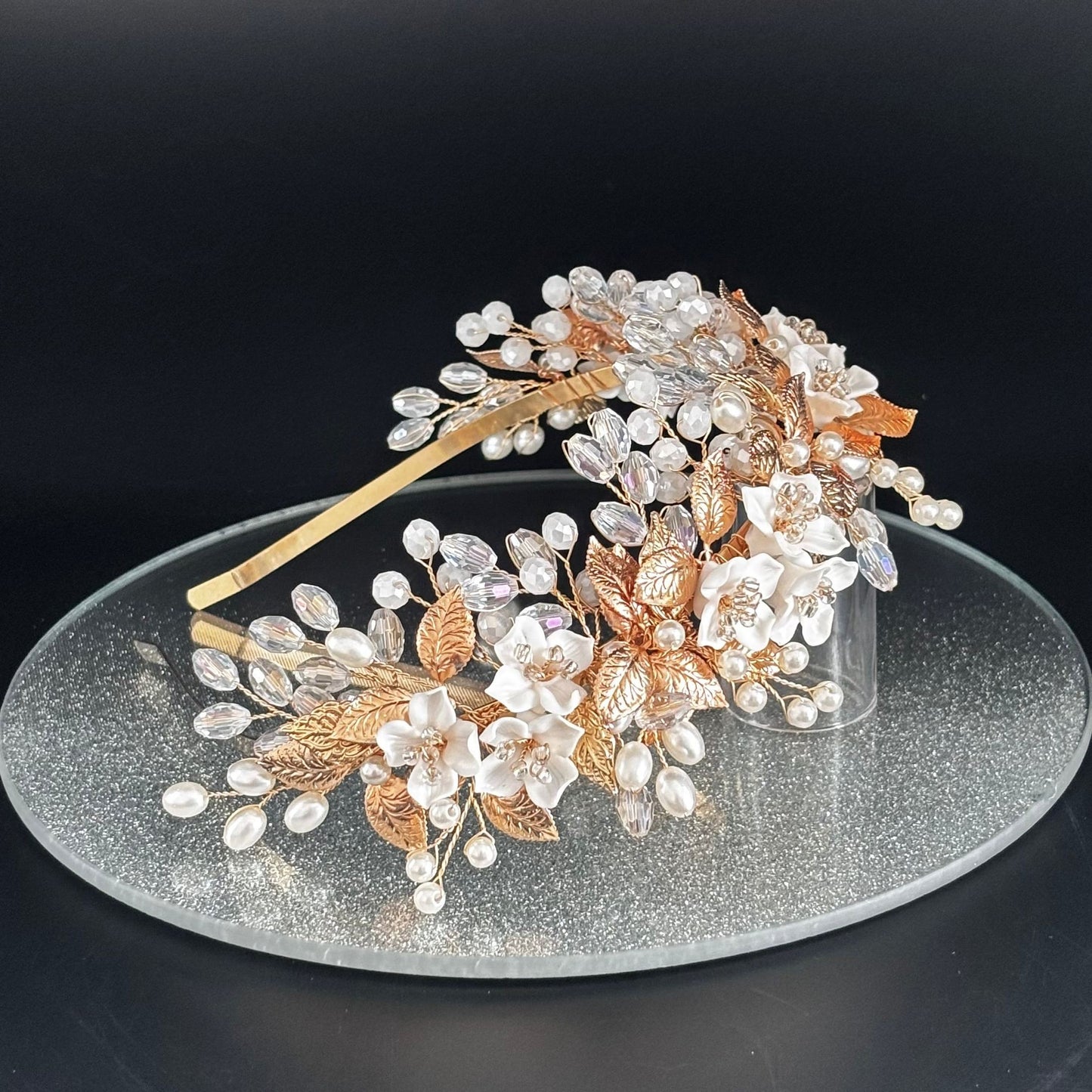 Gold Floral Wedding Headband Embellished with Crystals and Pearls