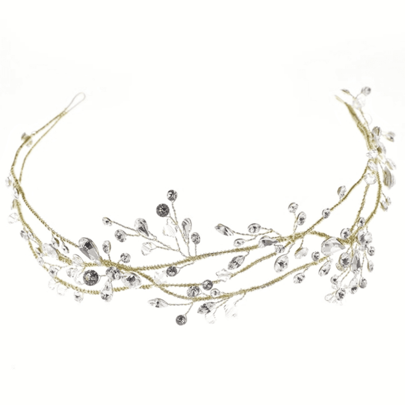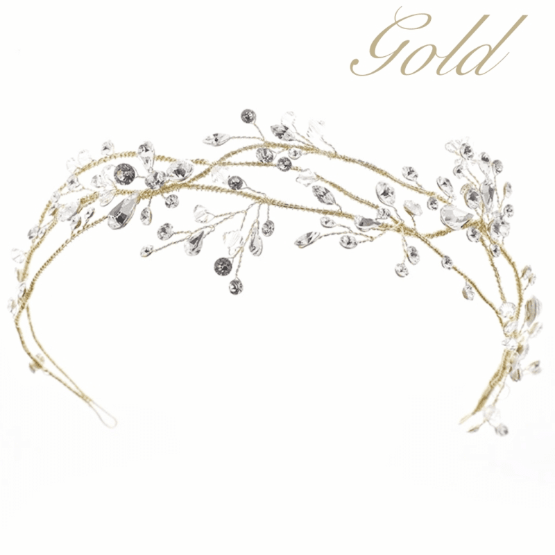 This stunning Bridal Headpiece is embellished with delicate high quality clear crystals on a flexible gold vine. This beautiful hair accessory can be worn as a headband or hair vine as it is made on a flexible vine.