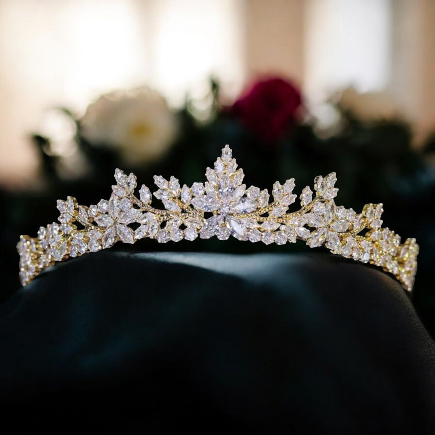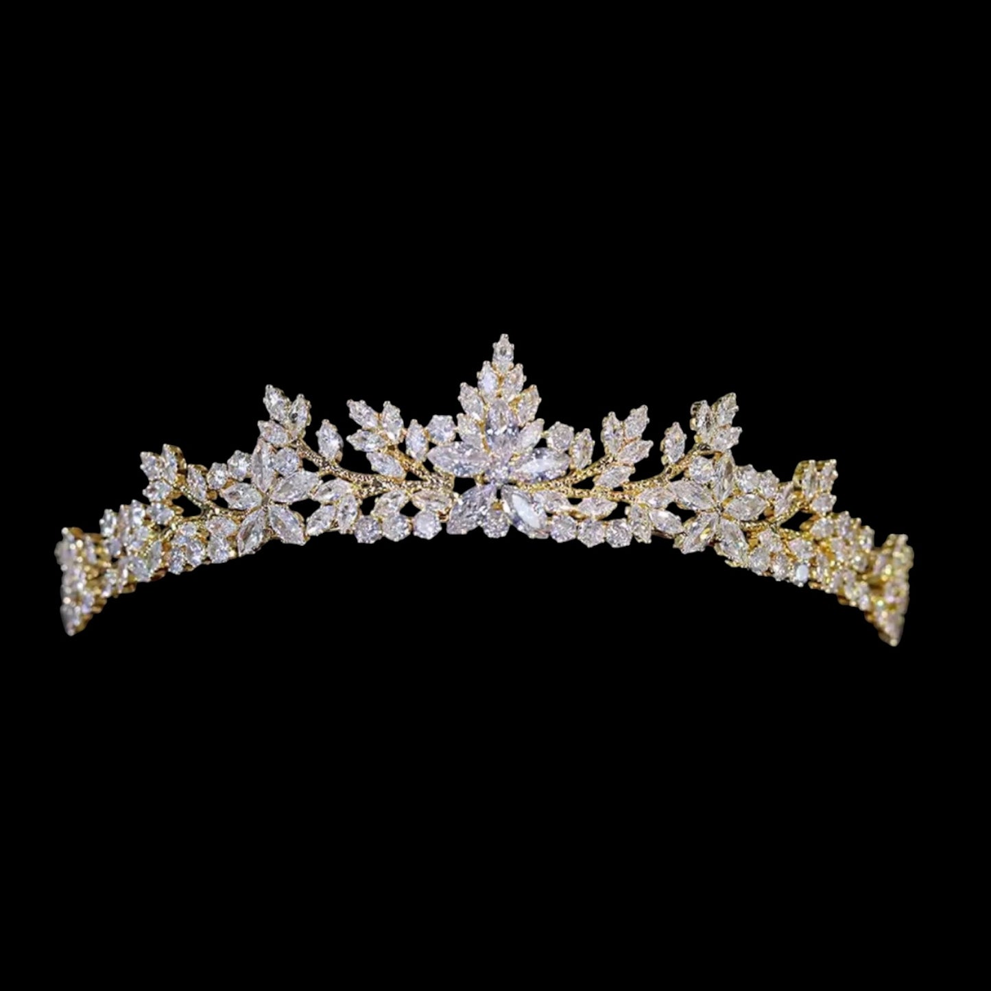 This exquisite gold crystal tiara brings timeless sophistication to your bridal ensemble. Featuring an intricate arrangement of precisely cut crystals in an organic floral design, it captures light beautifully whilst maintaining an understated elegance. The openwork construction ensures a weightless feel against your hair, whether styled in an elaborate updo, cascading waves, or sleek chignon. Each faceted stone contributes a refined sparkle that complements rather than competes with your natural radiance. The delicate leafy motif evokes a sense of graceful femininity, making it equally suited to romantic garden ceremonies or grand ballroom celebrations. This is a tiara that whispers luxury rather than shouts it—the perfect finishing touch for a bride who values understated glamour and timeless beauty.