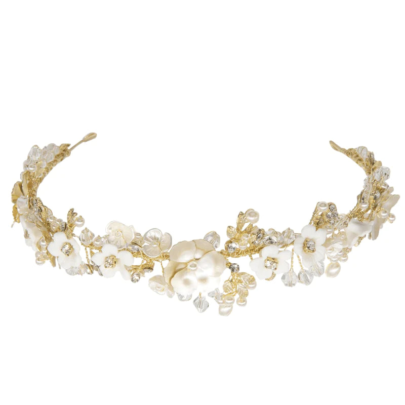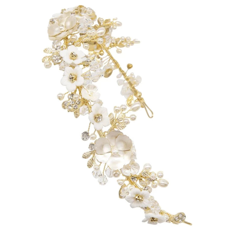 This beautiful gold bridal headband will certainly bring enchantment to your special day. Created with delicate clay flowers and surrounded by sparkling marquise crystals, clear cut crystals and crystal drops. This pretty bridal headpiece is so beautifully finished with such intricate detailing to bring harmony and sweetness to your bridal look.