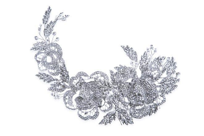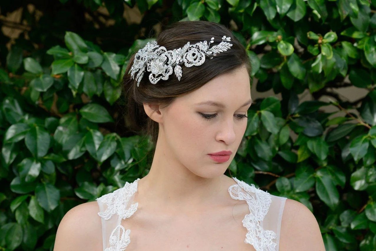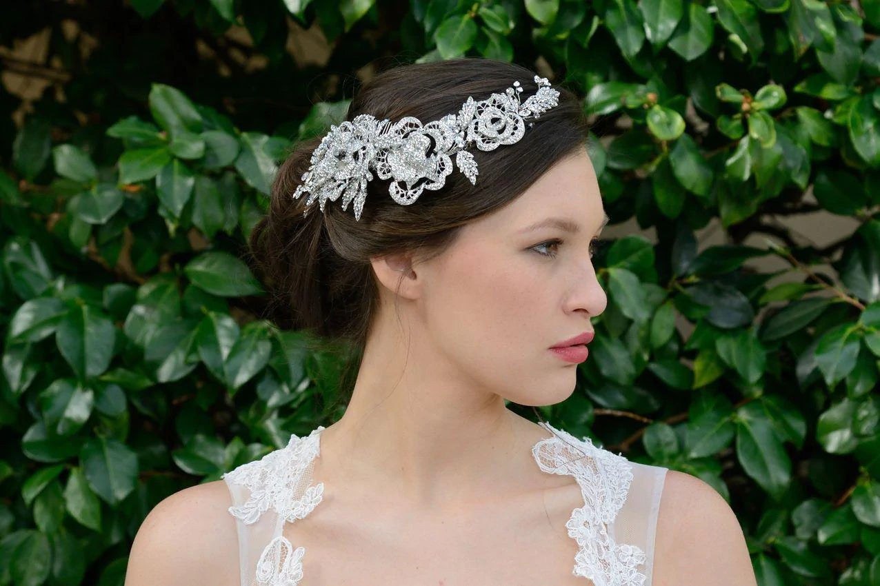 Fantasia Bridal Comb is a really impressive headpiece created using sparkling solitaire cut stones set in a beautiful floral pattern. This beautiful headdress is flexible and the flowers can be manipulated to change the shape. A stunning brides headpiece and very versatile as this can be worn so many ways with different hair updos and many dress styles from traditional to flowing contemporary designs.