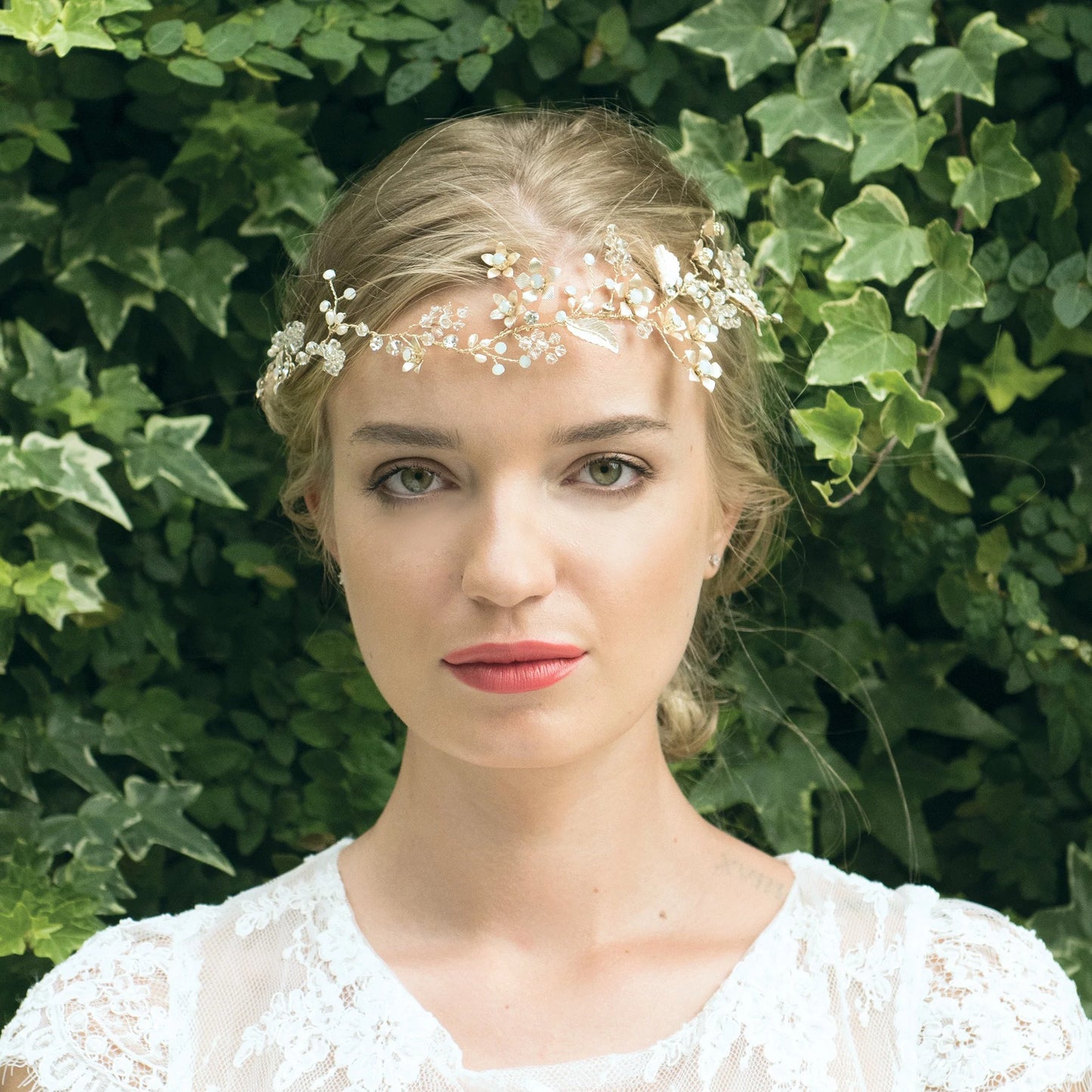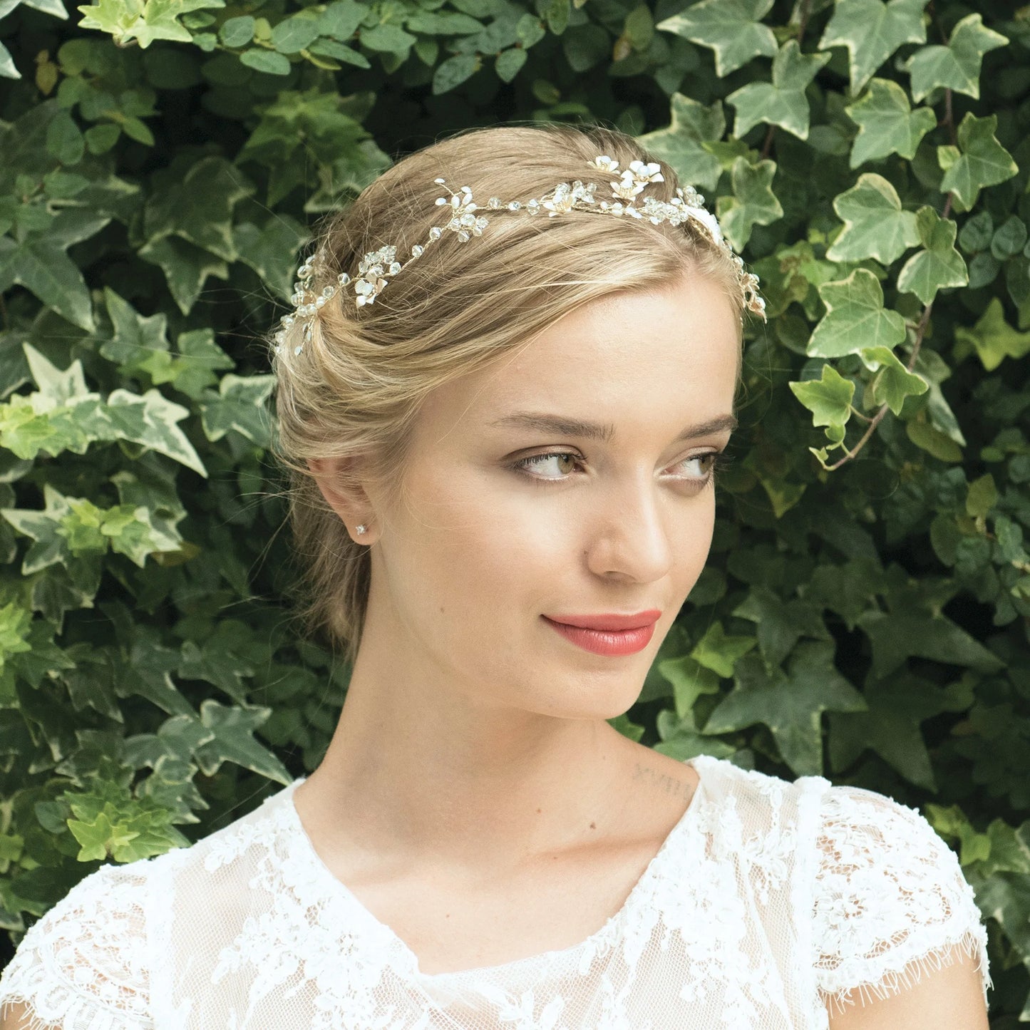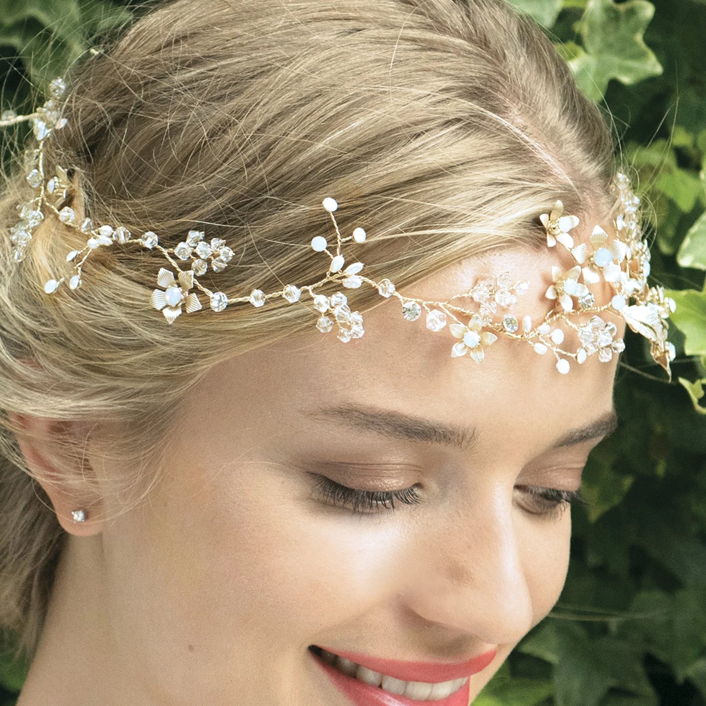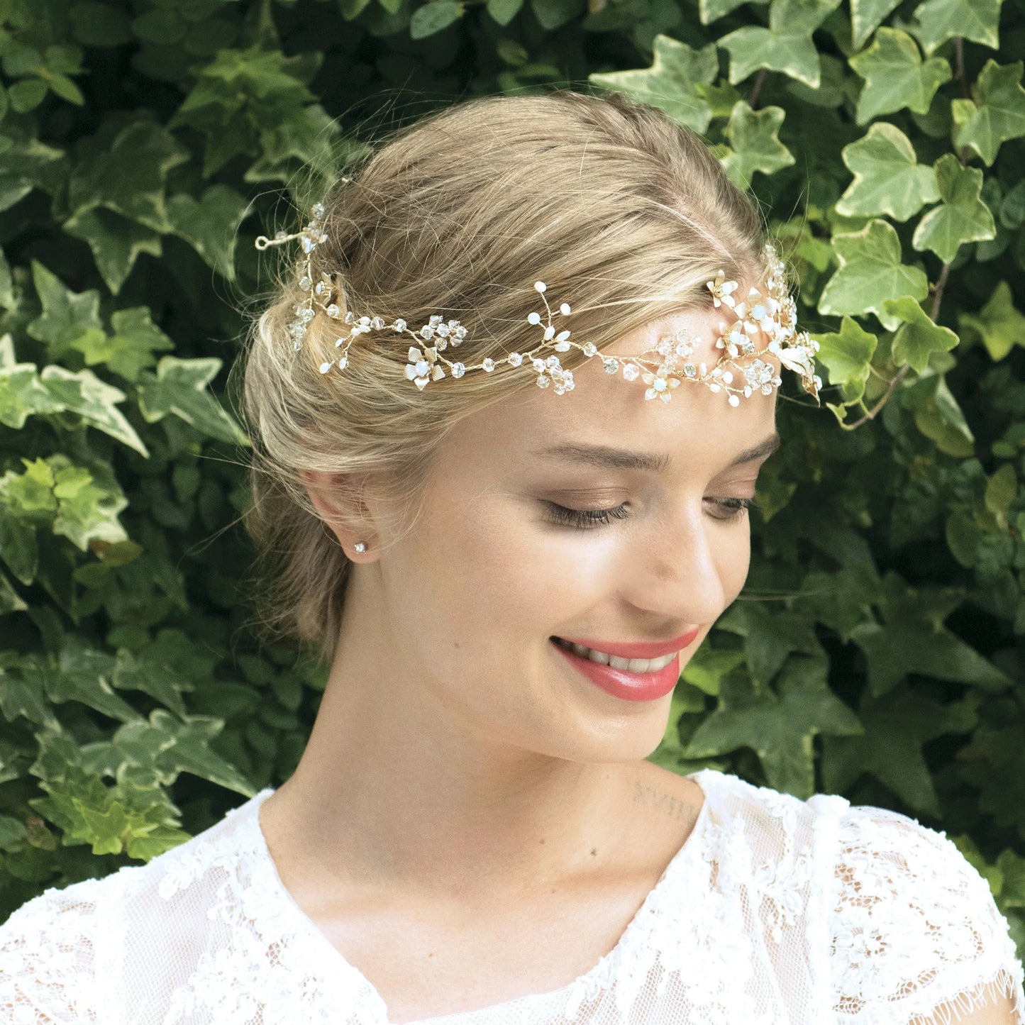 Summer Rose is a beautiful delicate bridal hair vine made using opalescent crystals, ivory freshwater pearls and hand painted enamelled flowers on flexible gold metal to allow for comfort. This stunning wedding headpiece can be worn in a long plait, around a chignon or over the forehead for a more bohemian look and suits most up or down hairstyles. A beautiful whimsical bridal headpiece to complete your bridal look.