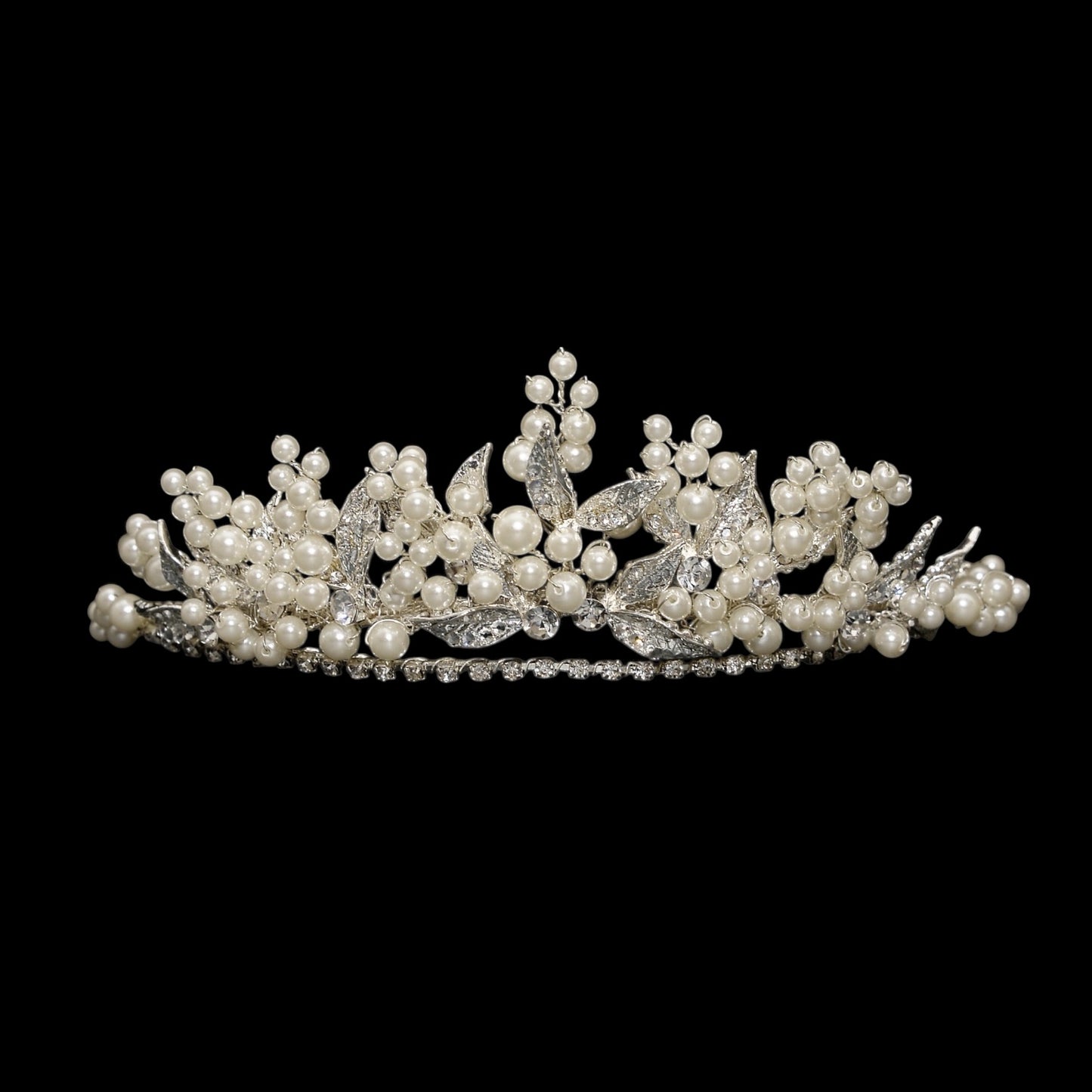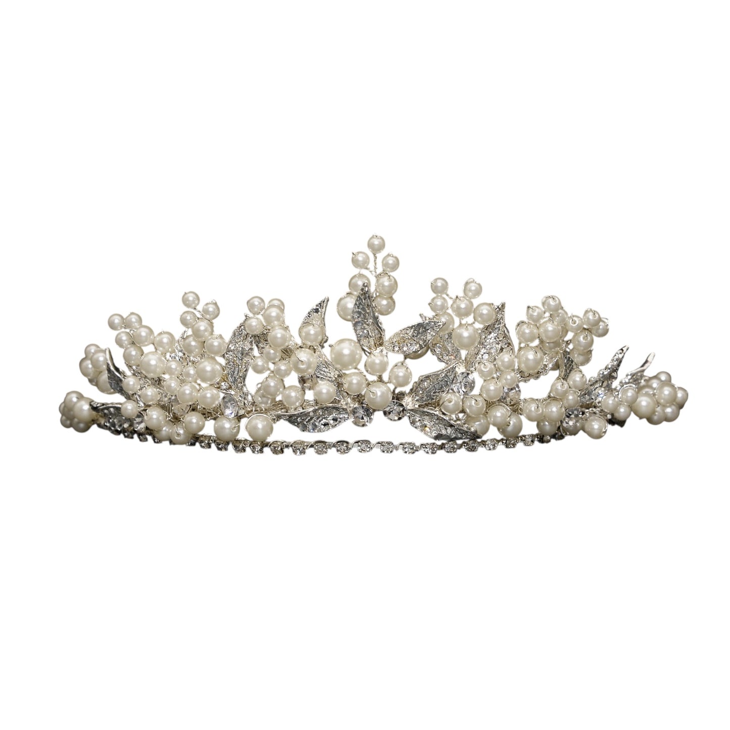 Delicate, romantic and effortlessly elegant, this pearl and crystal bridal tiara is designed to make a timeless statement. Featuring clusters of luminous ivory pearls entwined with shimmering crystal leaves, the tiara is crafted in a soft silver-tone finish that beautifully catches the light from every angle.