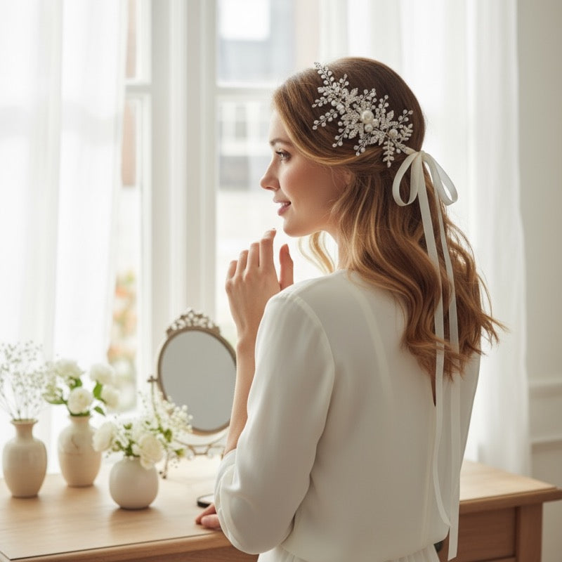 This elegant silver bridal hair vine features crystal-embellished leaves, simulated ivory pearls, and sparkling crystal beads for a refined bridal look. The high-shine silver finish complements any wedding gown, while the included light ivory ribbon offers styling flexibility—wear it secured or loose. A sophisticated accessory that adds understated glamour to your special day.