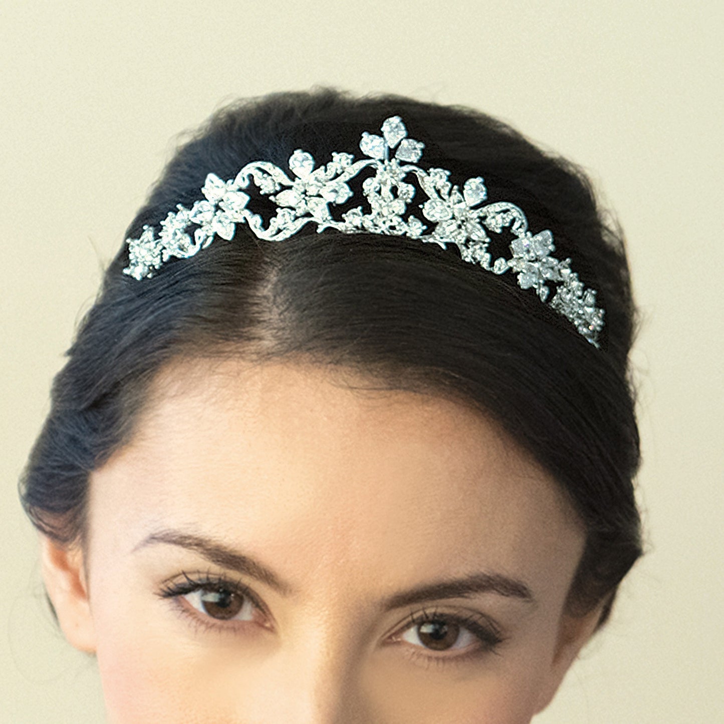 This is a beautiful graceful wedding tiara influenced by Victorian and Regency design. Embellished scrolls intertwine an array of brilliant cut solitaire, marquise and tear stones creating an exquisite effect. This bridal headdress looks beautiful with traditional dresses and with hair styled up. Set with genuine Austrian Crystals and Zirconia Crystal Simulated Diamonds.