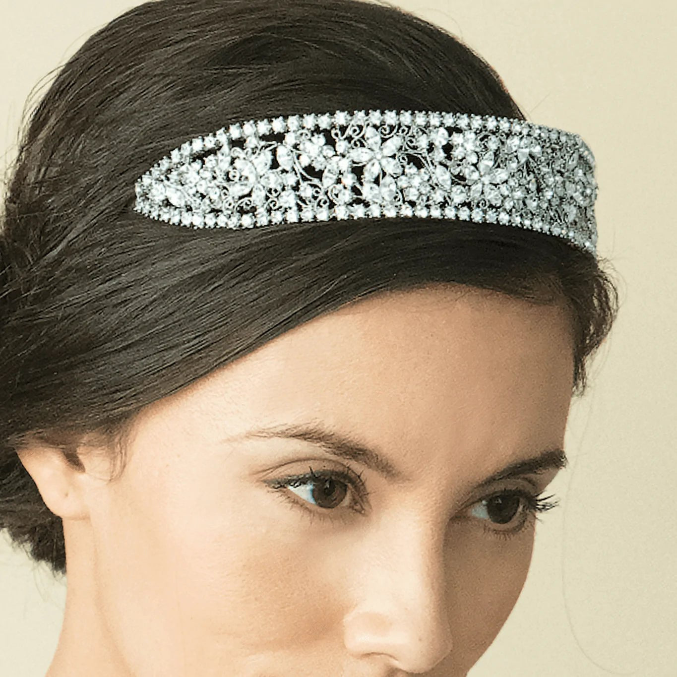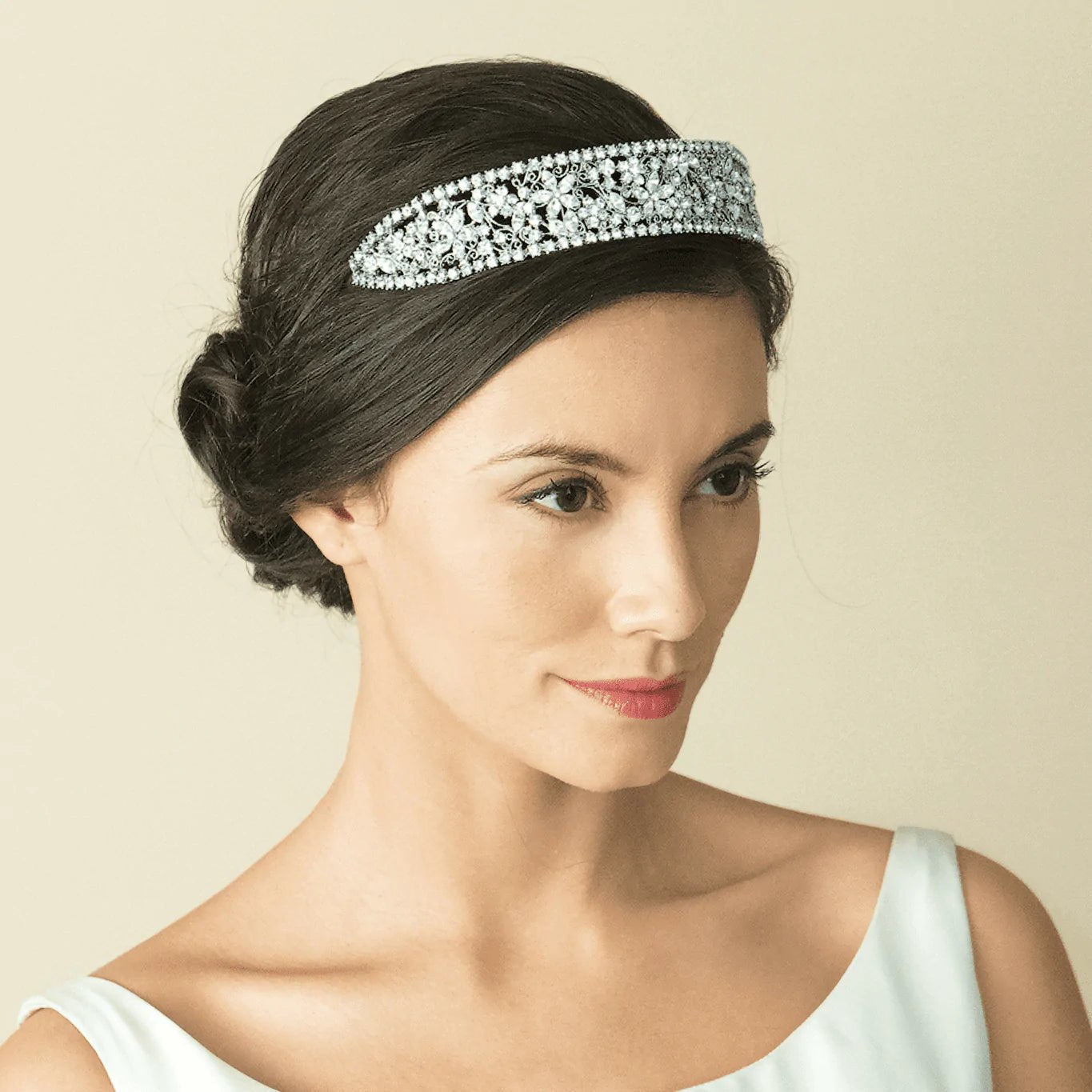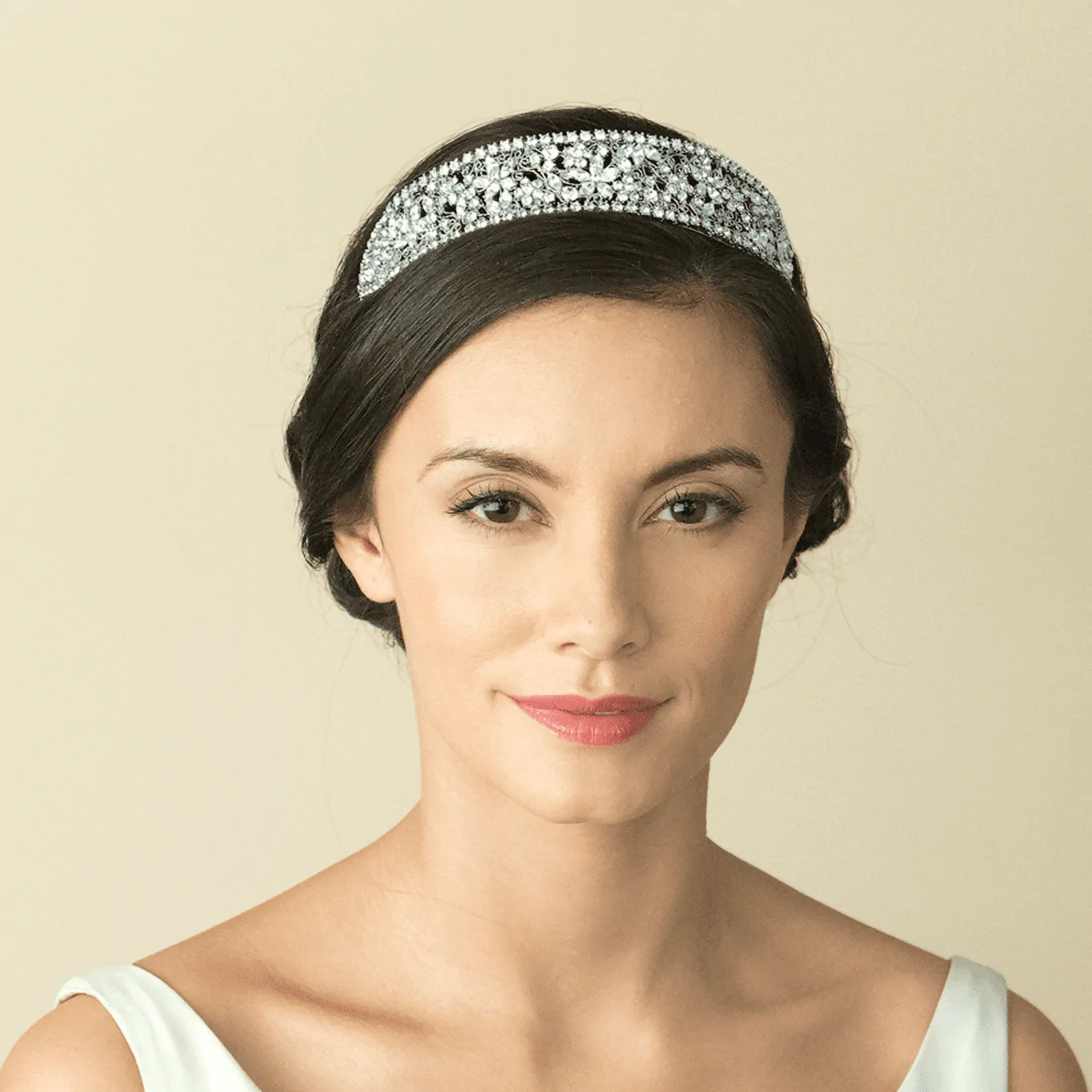 This Bridal headpiece truly is a stunning and popular design which feels utterly Royal. Created with delicate set crystals which sparkle beautifully as they catch the light. This wedding tiara can be worn high on the head around a hair bun or updo hairstyle, but can also be worn flat on the head as a pretty alice band. This is a classic design bridal headdress which would look wonderful with a simple elegant gown.