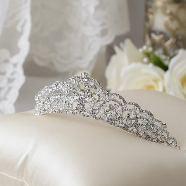 Adorned with luminous crystals and diamantes, this silver-tone tiara captures timeless elegance through its meticulously balanced design. Intricate scrollwork and openwork detailing create a delicate, lace-like aesthetic, while a striking teardrop crystal anchors the centre, surrounded by graceful leaf and floral embellishments. The uniform sparkle and polished finish deliver a refined, formal sophistication—perfect for brides seeking understated regal beauty. Its graceful proportions strike the ideal balance between presence and wearability, embodying classic bridal glamour without compromise.