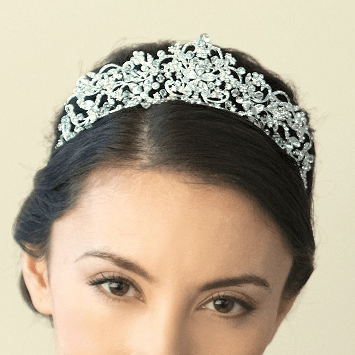 A very glamorous bridal tiara inspired by Victorian opulence. This beautiful brides headdress has been designed in a floral pattern and set with sparkling marquise and solitaire cut crystals. A stunning traditional tiara which would complement a classic style wedding gown with royal influences.