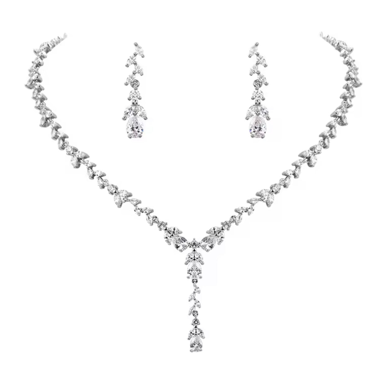 Radiate timeless elegance on your special day with our Bridal Jewellery Set. This dazzling duo features a delicately crafted Y-shaped necklace and coordinating drop earrings, adorned with marquise and pear-cut cubic zirconia stones that capture the light with every movement.