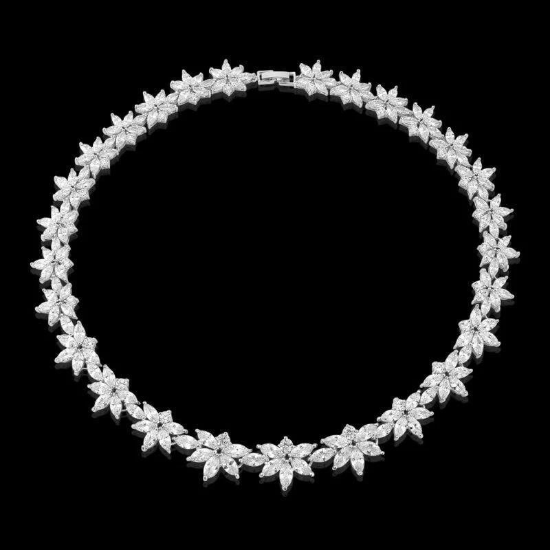 Floral crystal necklace and matching earrings set with rhinestone flowers – elegant bridal and prom jewelry in silver-tone finish