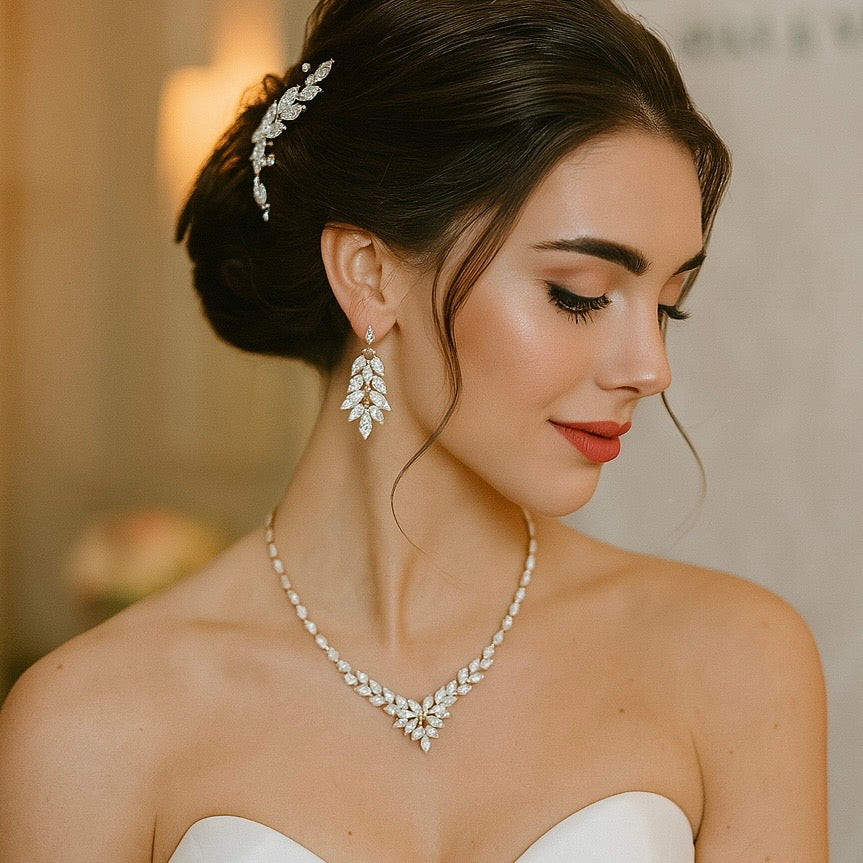 Elevate your bridal ensemble with this exquisite Crystal Bridal Jewellery Set, featuring a delicately designed V-shaped necklace and coordinating drop earrings. Each piece showcases a refined leaf motif, adorned with sparkling cubic zirconia stones that catch the light beautifully. The intricate craftsmanship highlights a natural elegance, blending timeless sophistication with subtle radiance. Ideal for brides who desire a graceful and classic accessory, this set enhances your wedding day look with a touch of understated glamour and enduring charm.