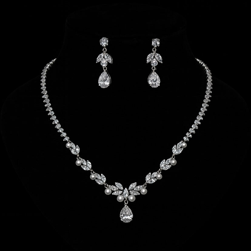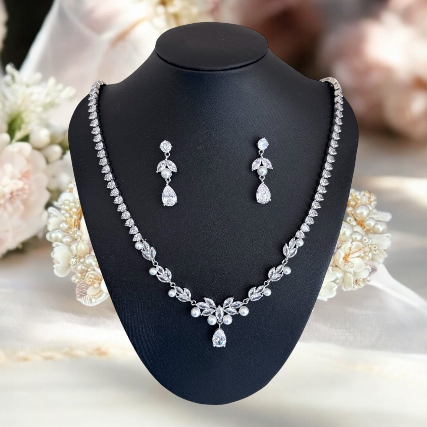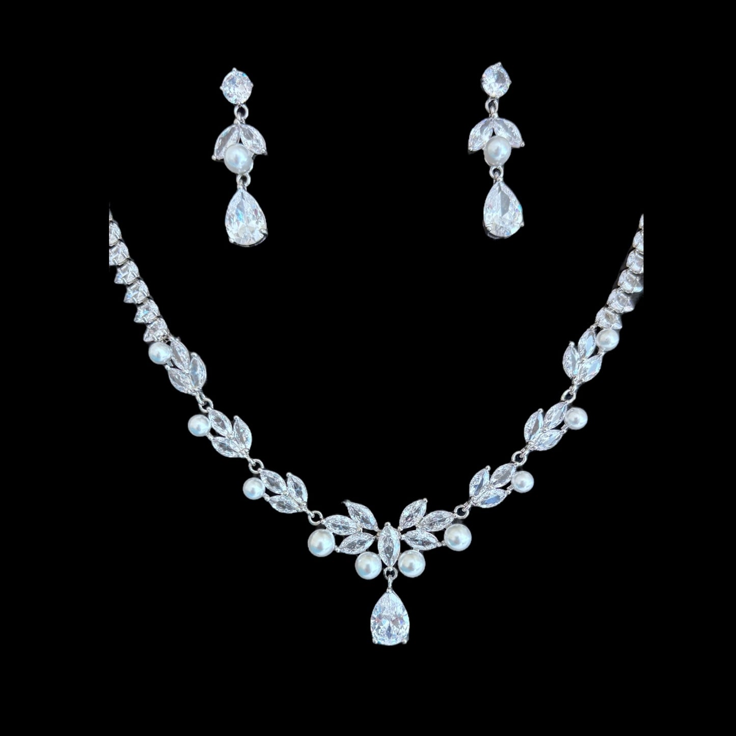 This exquisite bridal jewellery set features a sparkling crystal and pearl necklace and matching teardrop earrings, designed to add timeless glamour to your wedding day. The necklace is delicately crafted with marquise-cut stones and delicate pearls arranged in a graceful floral motif, finished with a dazzling teardrop pendant. The coordinating drop earrings complete the look with effortless elegance.