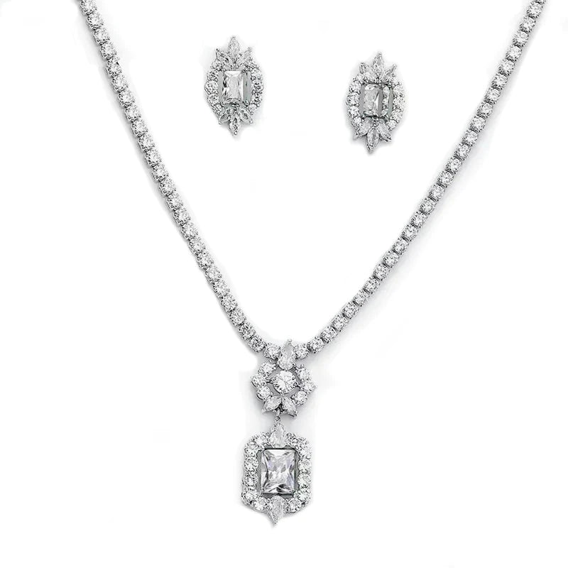 The perfect bridal jewellery or evening wear jewellery. This elegant, Gatsby inspired silver necklace comes complete with matching silver earrings, embellished with high quality clear cubic zirconia crystals on genuine 18k White Gold Plated finish with adjustable chain.