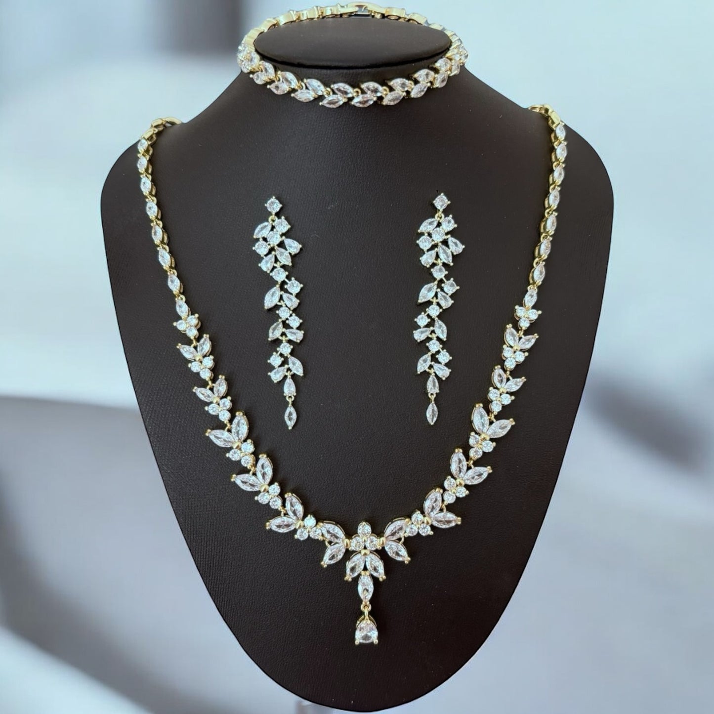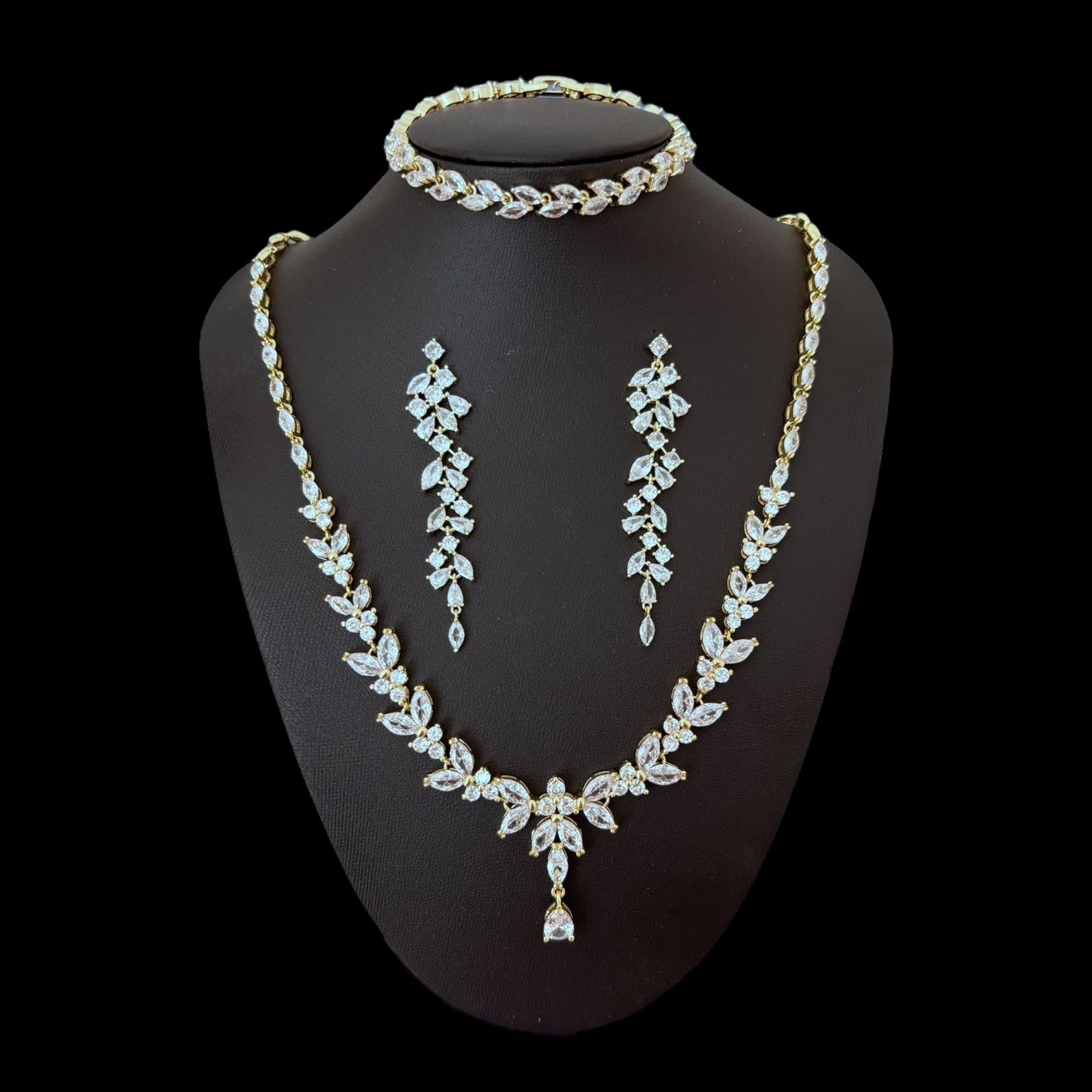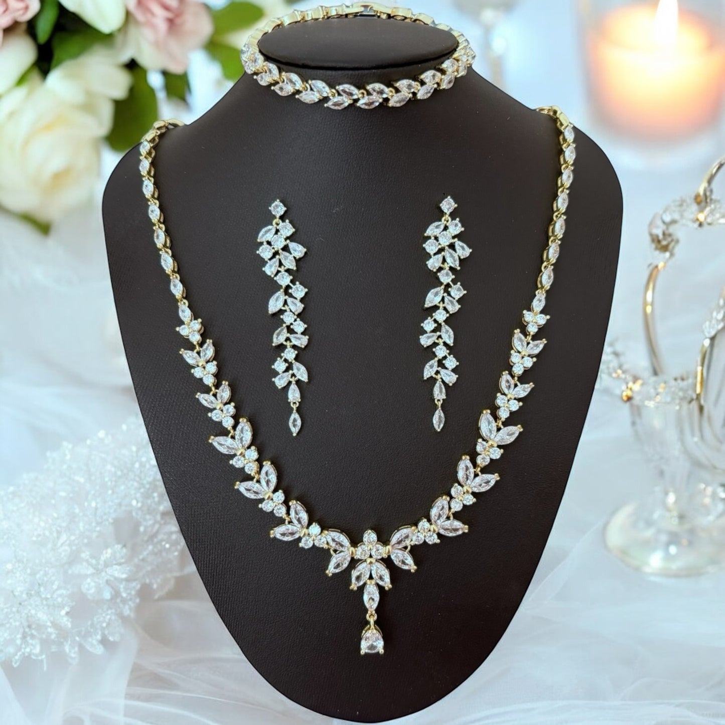 This exquisite bridal jewellery collection features a beautifully crafted necklace, coordinating bracelet, and earrings, each meticulously designed. Adorned with sparkling clear cubic zirconia crystals set against a gleaming gold-toned base, the set offers a refined and luminous elegance. Perfectly suited to enhance a bride’s wedding attire or elevate an evening gown, it embodies timeless sophistication and luxury. With its exceptional craftsmanship and radiant brilliance, this set ensures you will shine with confidence, making it an ideal accessory for your most cherished moments.