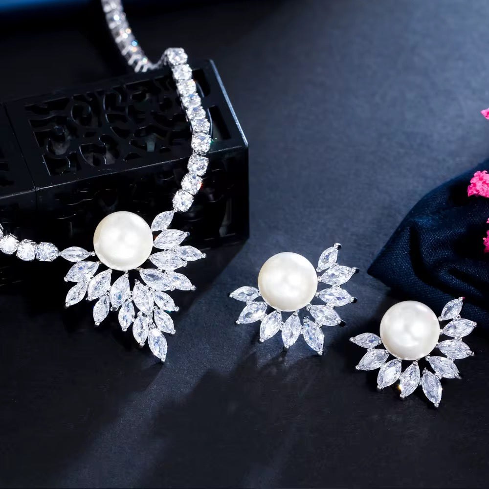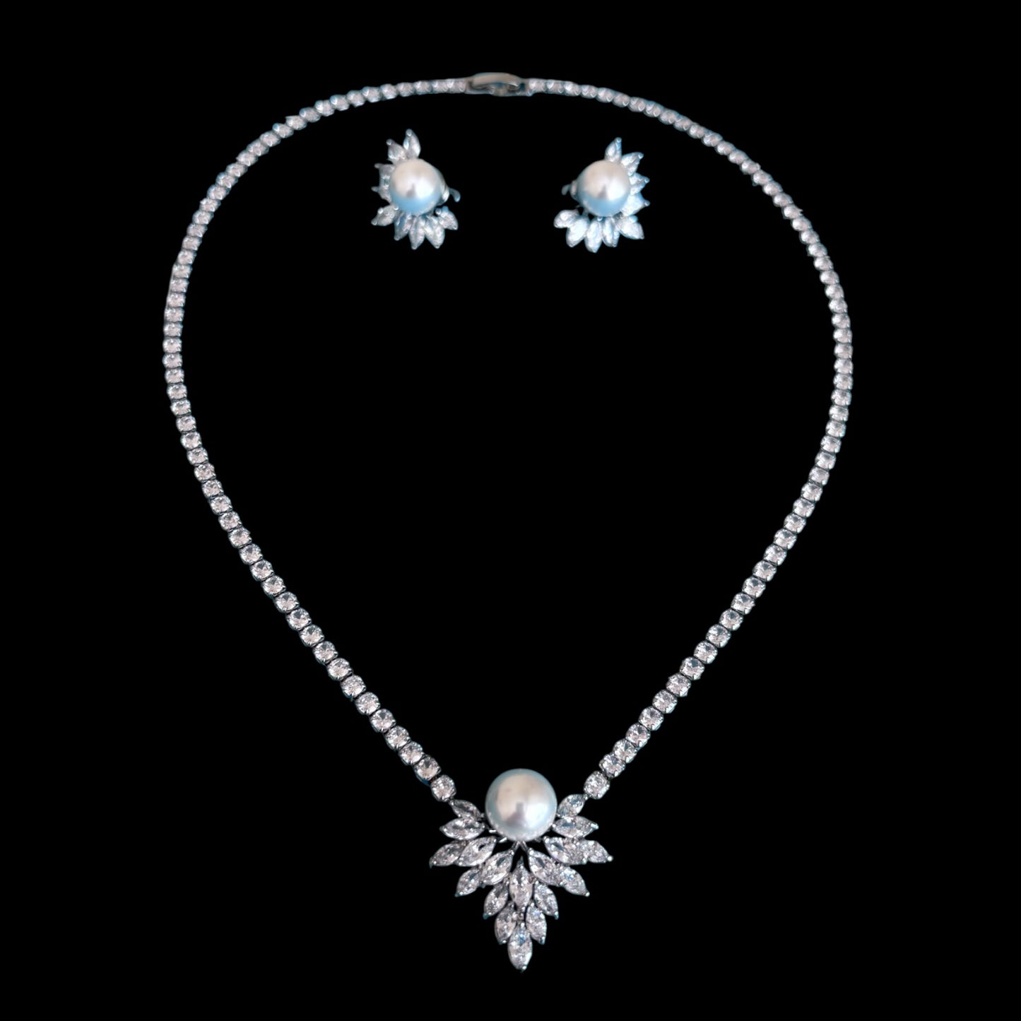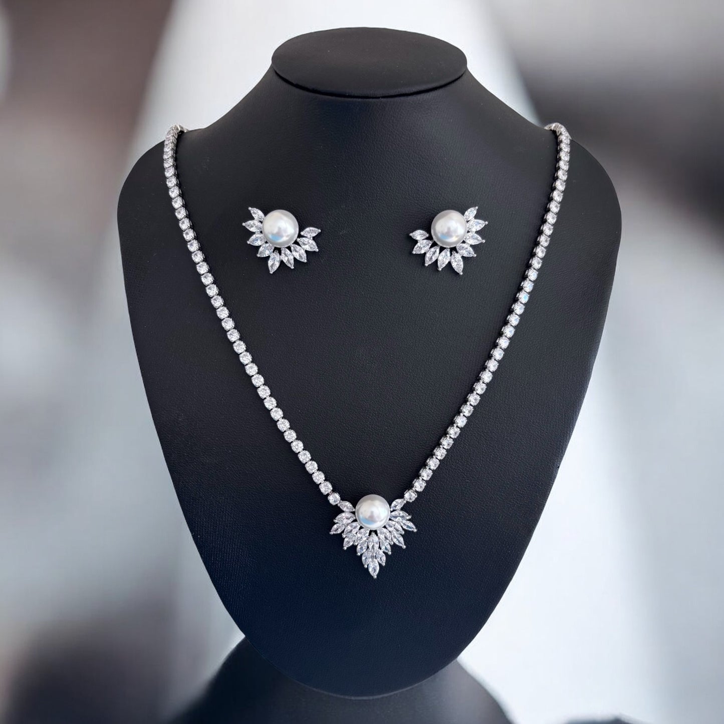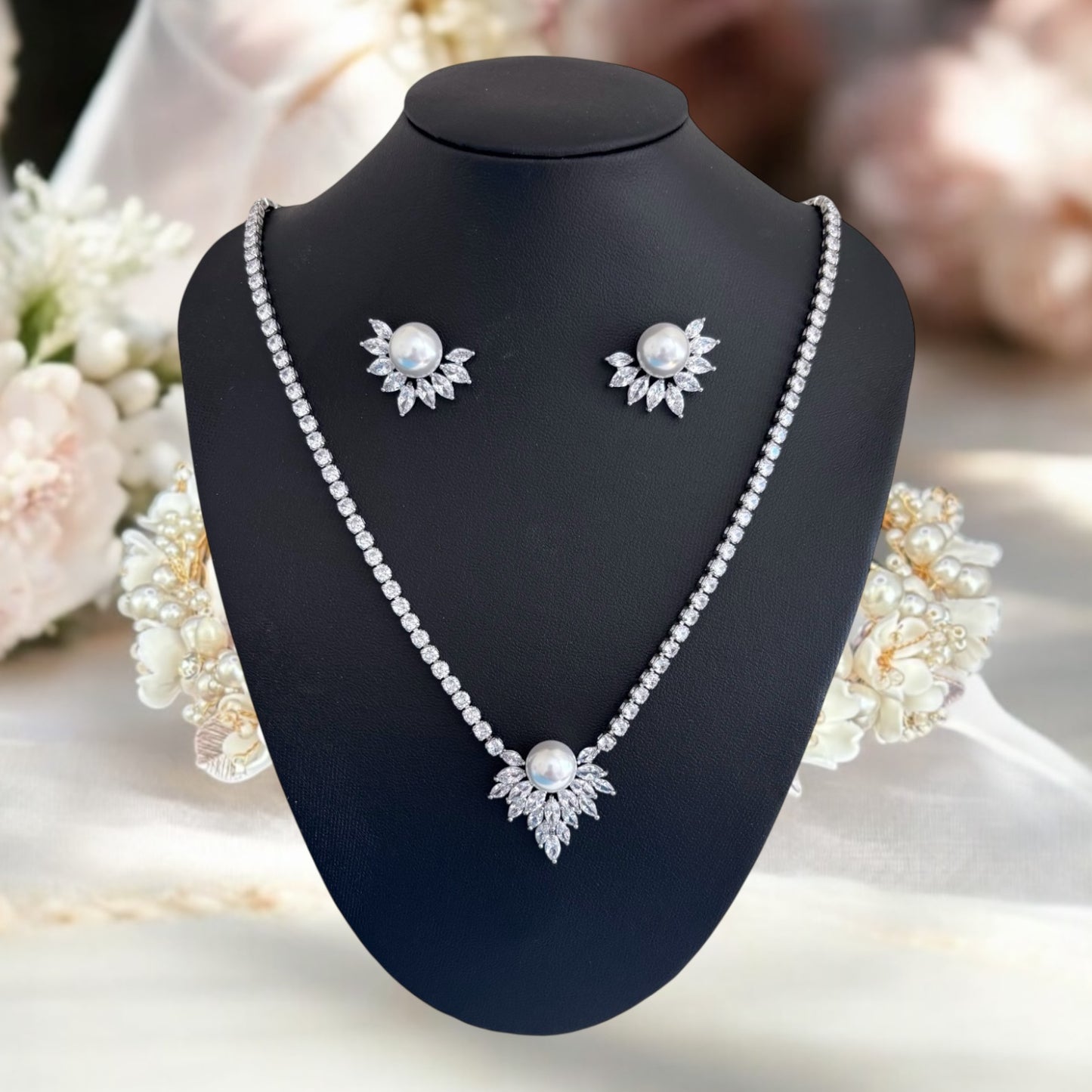 Elevate your bridal look with this timeless pearl and crystal jewellery set, designed for elegance and sophistication. The necklace features a delicate strand of sparkling crystals, finished with a bold round pearl centerpiece surrounded by a cluster of shimmering marquise-cut stones. The matching stud earrings echo the same radiant design, creating a perfectly coordinated wedding jewellery set.