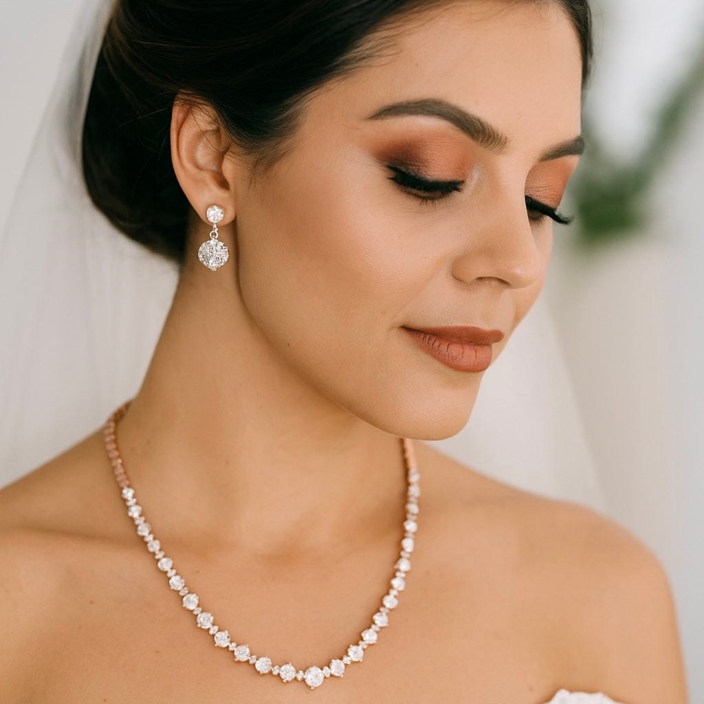 This elegant wedding jewellery set features a beautiful bridal necklace paired with matching drop earrings, each embellished with sparkling round-cut crystals that shimmer with every movement. The necklace boasts a classic design, highlighted by a slightly larger central stone that serves as a captivating focal point. The coordinating earrings offer a delicate drop style, adding refined grace and harmony to the set. Made from polished rose gold-toned metal, this exquisite collection blends timeless brilliance with subtle luxury, perfect for enhancing the elegance of any bridal ensemble.